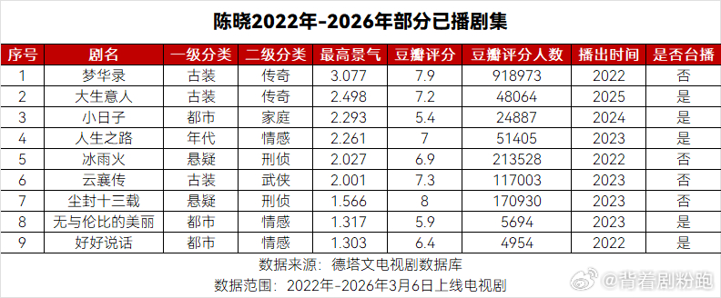 陈晓选本这块战绩可查陈晓的魅力从不止古装颜值,更是实打实的演技与选剧本眼光好!从《人生之路》到《大生意人》收视一路领跑,多部作品口碑热度双丰收,深耕角色,不炒作不浮躁,每部剧都品质在线,陈晓真的很让人敬佩!期待陈晓待播剧《秦谜》《隐瞒之事》《云襄传之将进酒》陈晓样样顶