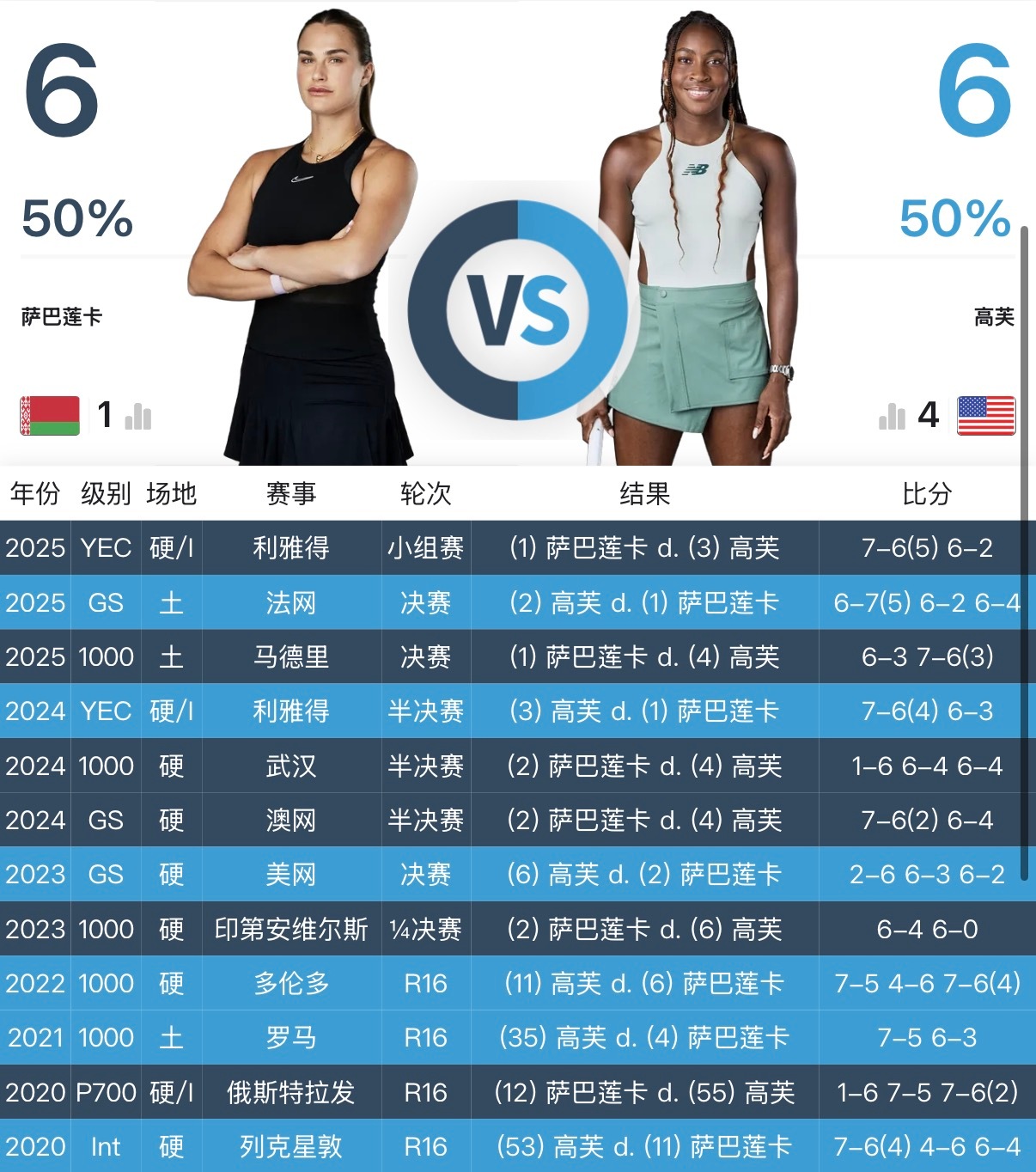 WTA迈阿密决赛,萨巴伦卡vs高芙两位选手交手过12次,平分秋色