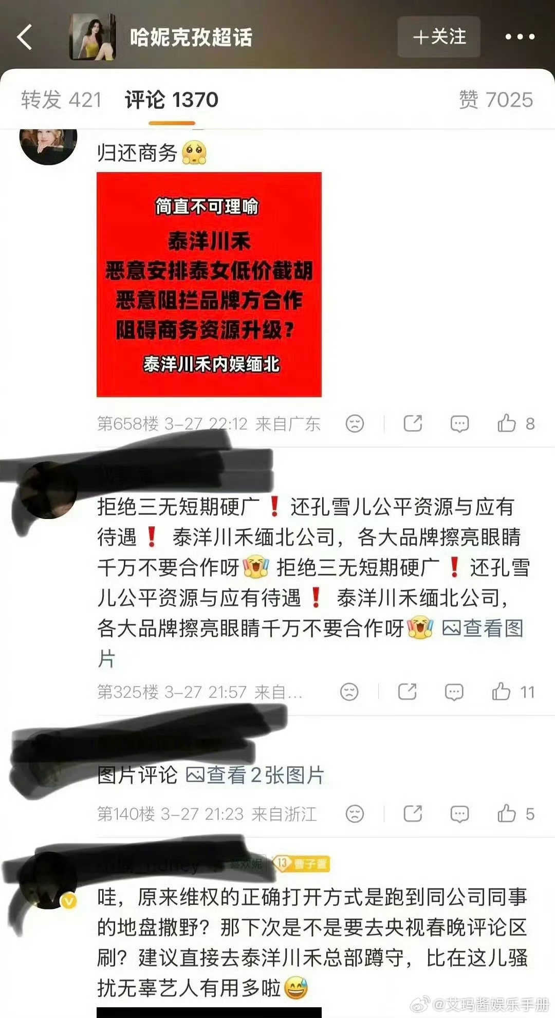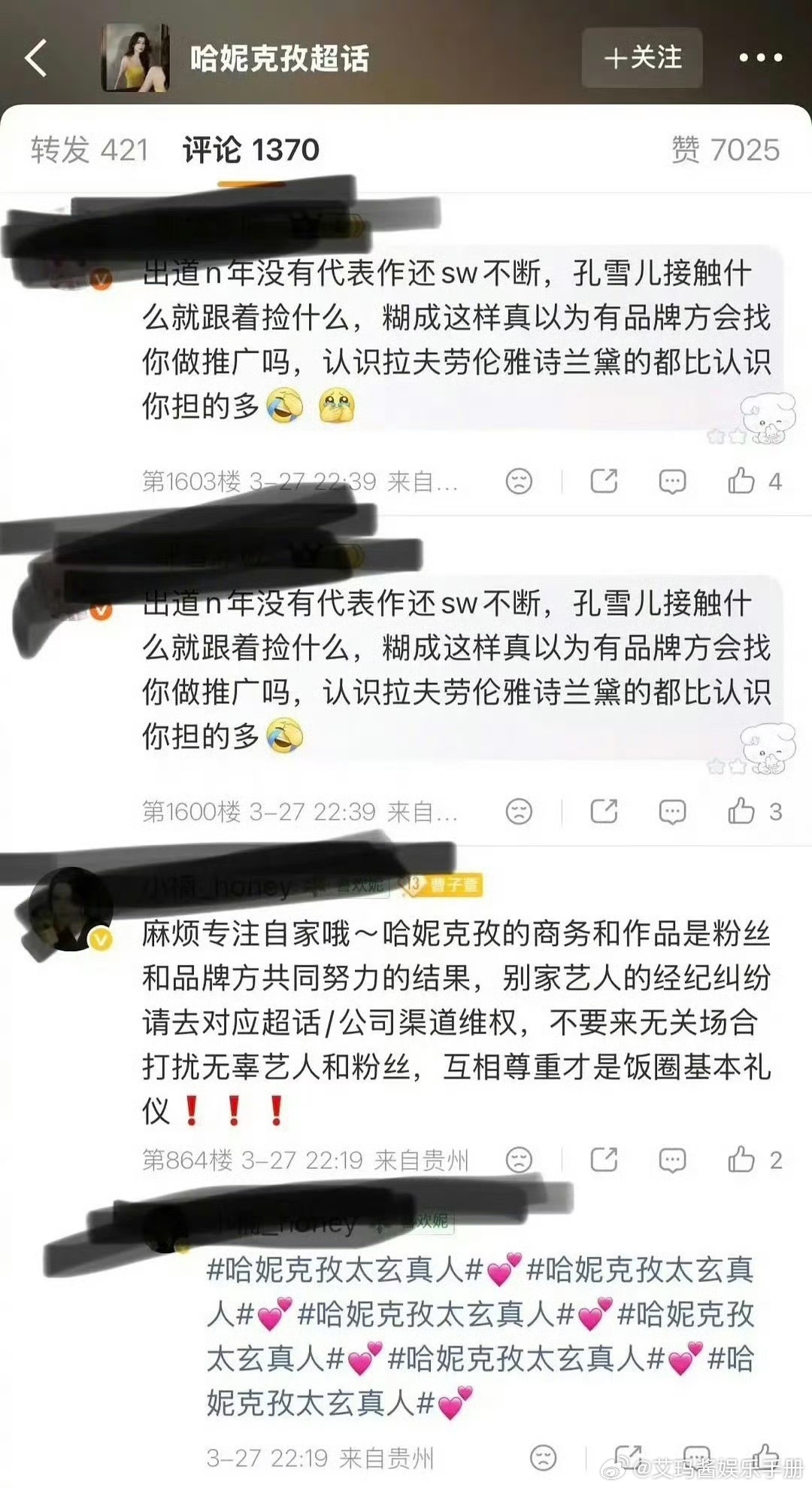 🍉孔雪儿粉丝疑因孔雪儿与同公司的哈妮克孜6年前的商务重合,冲了哈妮克孜和品牌方,你怎么看?