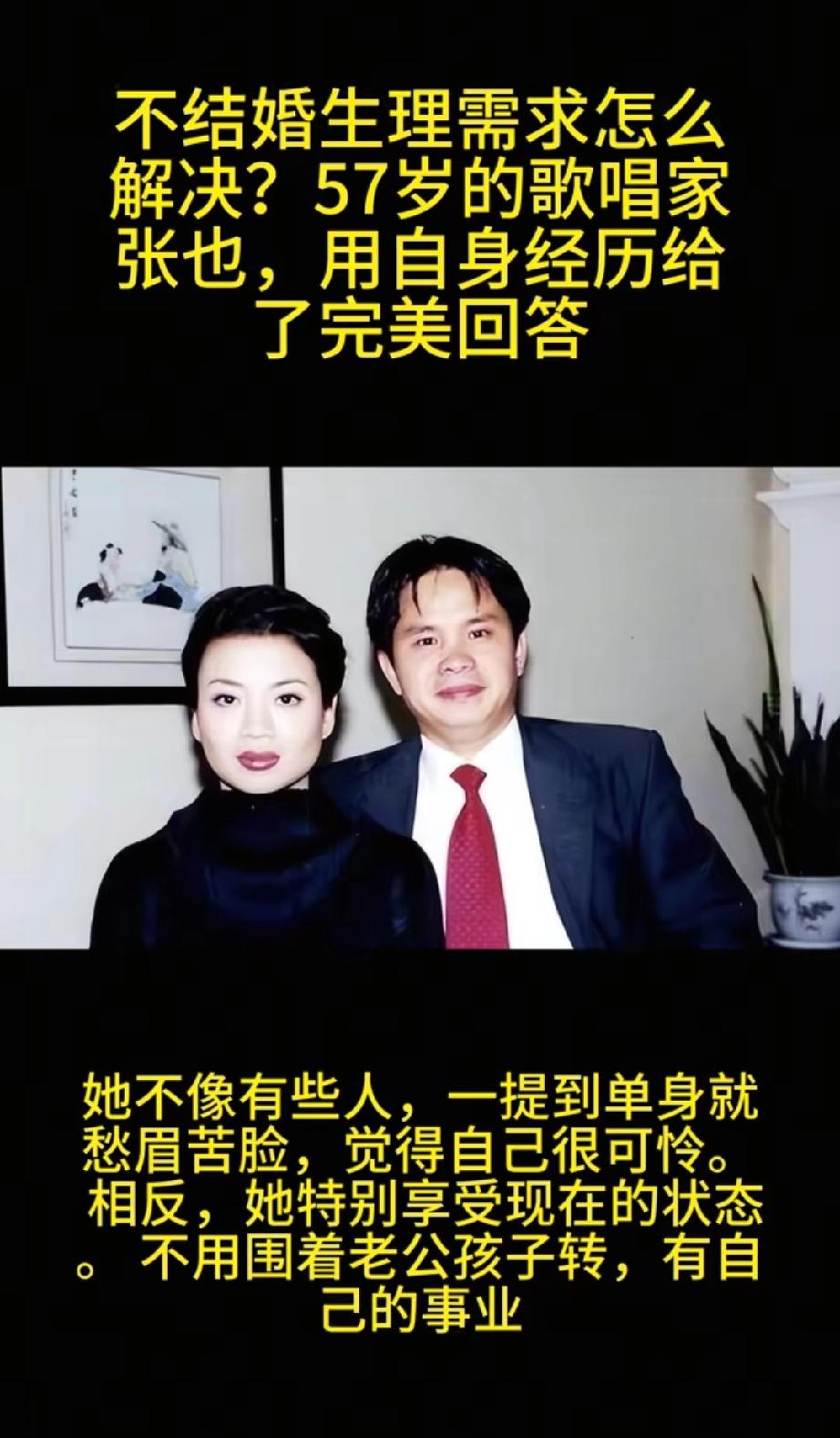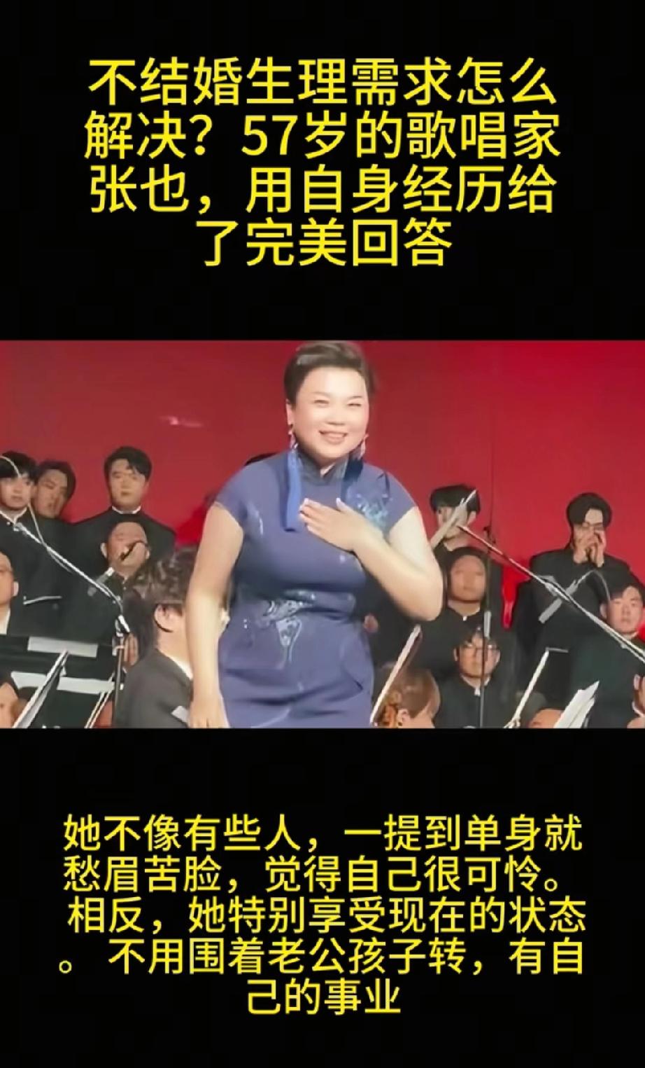 不结婚怎么解决生理需求?57岁的歌唱家张也,用行动给出了答案。 57岁的歌唱家张也未婚未育,外界总追问她不结婚怎么解决生理需求,这问题尖锐又带着习惯性打量,仿佛女性没婚姻孩子就得交份解释书。但张也没理会,她把答案放在舞台、自律和选择里。 2026年初,57岁的她仍活跃在央视文艺晚会舞台,礼服得体、声音清亮,状态完全不像年过半百。她27次登上春晚,靠的是实力。她1988年获奖,1989年首登春晚,此后佳作不断。她没把需求只寄托在婚姻,而是在事业、友情、亲情里收获满足。她用行动证明,没人规定女人必须结婚。