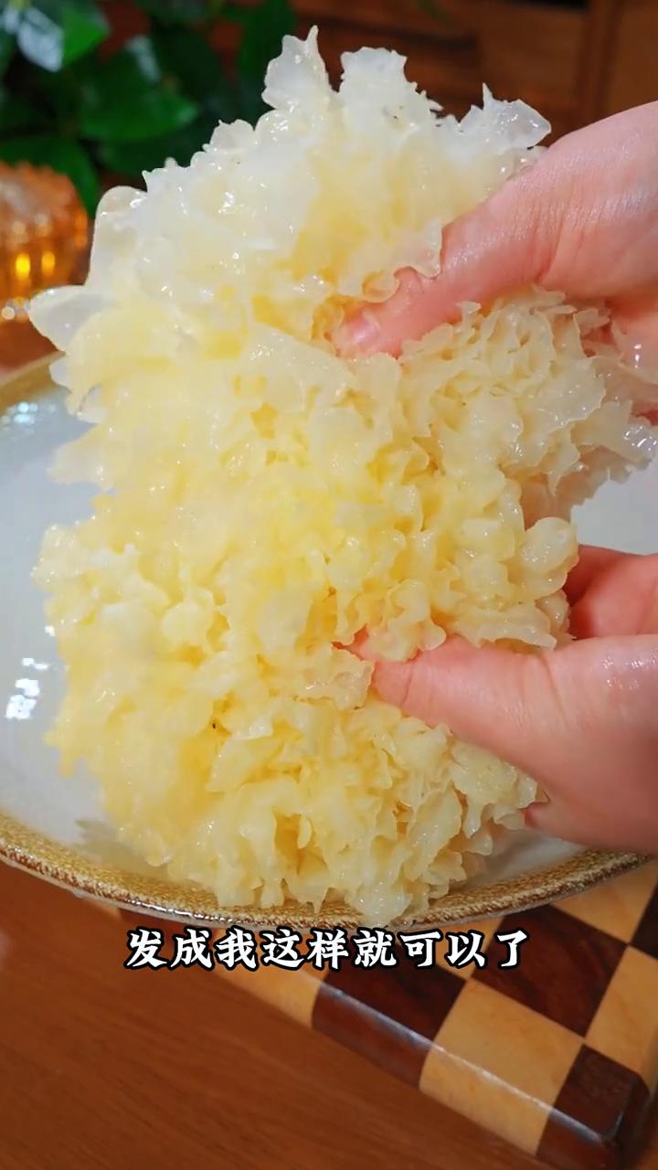 银耳雪梨西米露。 99%的人都不知道气血不足老得快,现在开始你就这样吃,再贵的护肤品都比不上。 ·买回来的银耳加一勺盐、一勺面粉,这样容易泡发也更容易清洗干净。 ·大概泡上20分钟,发成我这样就可以了。 ·一定要给它切碎一点,切的越碎越容易出胶。 ·切好后丢进家里的电饭锅,放半个苹果。