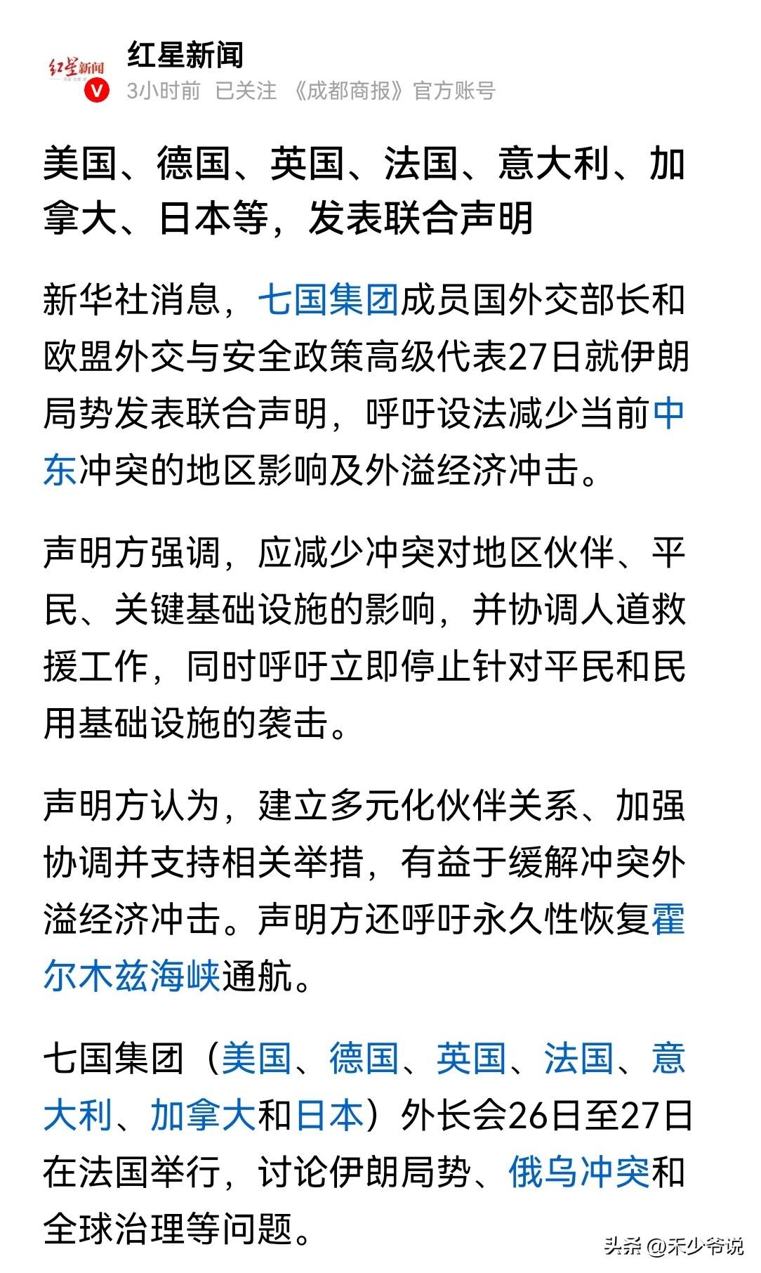 如果说伊朗的难度是高级,那么东大的难度就是地狱级 27日七国集团发表联合声明,声明呼吁设法减少当前中东冲突地区影响及外溢经济冲击,但是声明全程都没提联合护航。 从此来看七国集团中除了美国之外其他六国都不准备“掺和”美伊冲突,简单来说就是“怂了”,然而如果说伊朗的难度是高级的话,那么东大的难度就是地狱级,就这七国集团还天天挑衅中国,中国的愤怒可是要比伊朗可怕数千倍。 所以美伊冲突之后明显七国集团都冷静了很多。