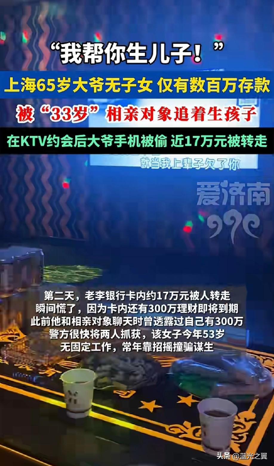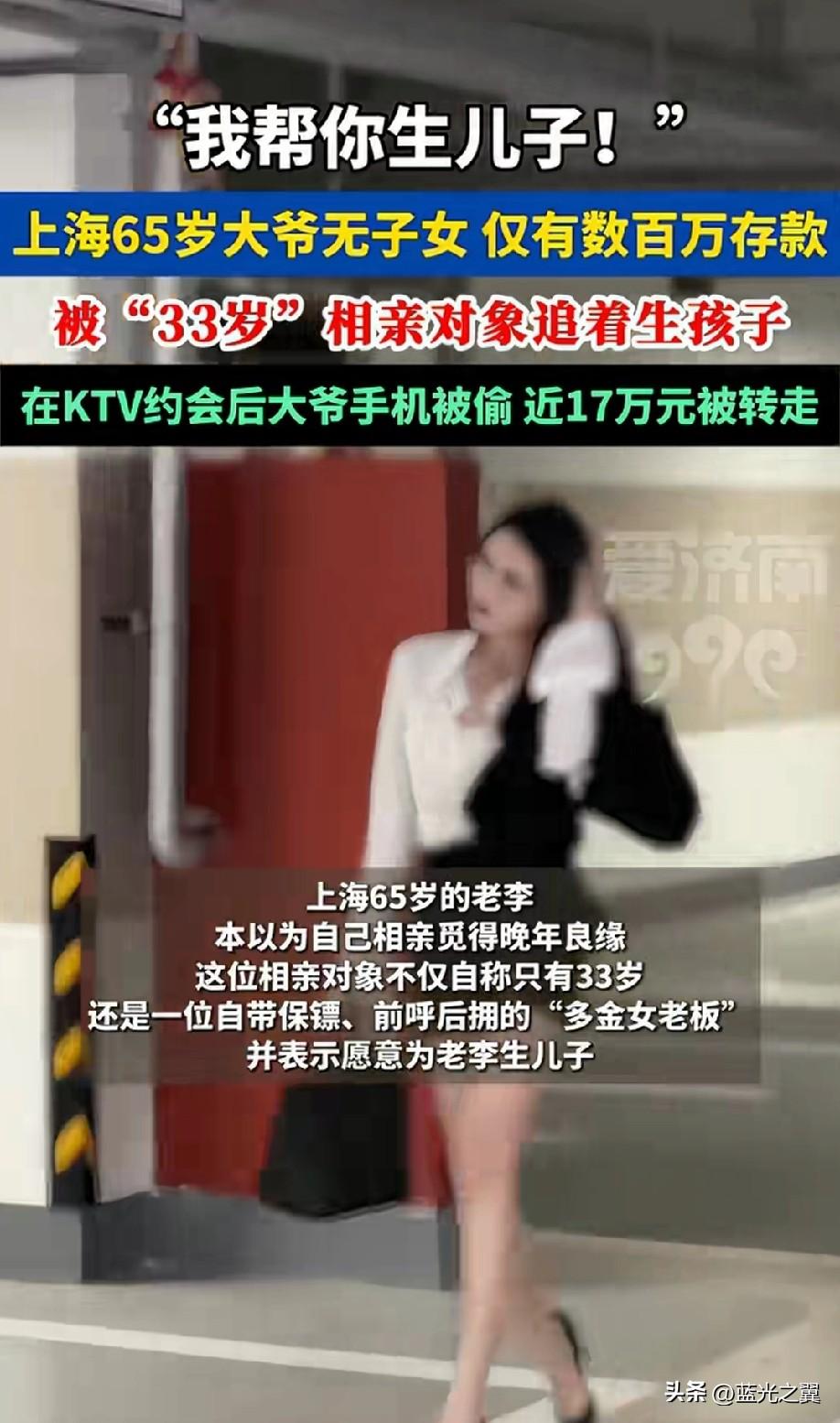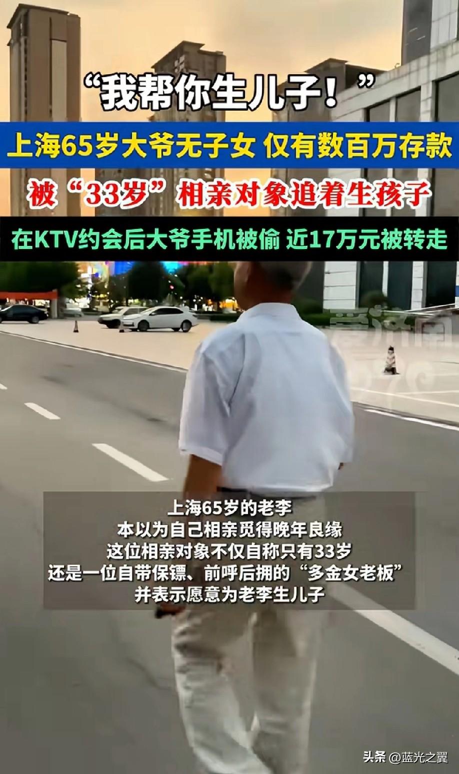 “色字头上一把刀!”上海,一65岁老伯无子女,如今老了想觅得一份晚年缘分,在相亲角认识一名自称“33岁”音乐老师的女子,称“愿意给他生儿子”,老伯便信了。直到自己手机被偷,卡里的16.9万元被转走后,老伯才看清这一切都是女子的骗局! 老李(化名)如今65岁了,离异多年,无儿无女,晚年孤独。像许多独居老人一样,他想找个伴儿共度余生。在相亲角,他“偶遇”了一名自称33岁的女子——陈梅(化名)! 初次见面,陈梅精心设计了一场“偶遇”变“惊艳”的戏码。她乘坐网约车抵达饭店门口时,一名年轻男子快步上前拉开车门,恭敬地称呼她“钱总”! 这一细节让老李印象深刻。在他眼中,眼前这位女子不仅年轻,还是位“多金女老板”——有人伺候,排场不小。尽管陈梅的相貌与33岁的年龄描述存在差距,老李心中虽有疑虑,但对方的“气场”让他选择了相信! 然而,当老李提出要看身份证核实时,陈梅百般推脱。老李心生警惕,果断将其拉黑! 如果故事到此结束,老李不过是经历了一次不愉快的相亲。但一个月后,陈梅换了一个号码再次打来。她没有道歉,没有解释,只说了一句话: “我帮你生儿子。” 这句话精准地击中了老李最柔软的地方。“我没生过孩子,家里没人了,就这一个心愿。”老李后来在报案时这样解释自己为何再次上当! 重新取得信任后,两人第三次见面,约在了一家练歌房! 监控录像显示,当晚老李和陈梅在包间唱歌。点餐付款时,原本各自坐在沙发两头的两人,陈梅总会“自然而然”地凑近老李身边。正是在这个过程中,她记住了老李的支付密码——六个简单的数字“123456”! 趁老李上厕所的间隙,陈梅迅速折返包间,停留一分钟后匆匆离开。老李回来后发现手机不翼而飞,拨打过去,一名自称出租车司机的男子接听,称手机在宝山,要么支付1000元“送机费”,要么自己来取! 老李选择了报警。 但真正的损失才刚刚开始。第二天,老李发现手机绑定的银行卡内16.9万元被连夜转走,收款人正是那个接电话的“出租车司机”——一个叫刘源(化名)的男子! 原来,手机只是幌子,银行卡里的积蓄才是真正目标。更让警方吃惊的是,陈梅对老李的家底了如指掌——她知道老李还有300多万元理财即将到期。这些信息,都是此前两人相处时,老李被“套话”泄露的! 警方调查揭开了陈梅的真实面目! 她根本不是什么33岁的音乐老师,而是53岁的无业人员,常年靠招摇撞骗谋生。那个开车门的年轻人,是她花钱雇来撑场面的“道具”——每次三五百元,先后雇佣了十几二十次! 刘源也不是什么出租车司机,而是她的“私人保镖”。当晚两人从练歌房离开后,直奔银行ATM机取现,随后连夜乘网约车逃往江西赣州! 有意思的是,到赣州后,刘源心生贪念,想独吞剩下的钱,竟独自买了火车票返回上海——正好被警方在火车站逮个正着。几天后,陈梅也在上海一家酒店落网! 目前,两人因涉嫌盗窃罪已被黄浦区人民检察院批准逮捕。警方已为老李追回5万多元,挽损工作仍在继续! 老李的16.9万,买来的不是儿子,而是一场深刻的教训。但这份教训不应只由他一个人承担。当一个65岁老人因为“想有个孩子”而被骗走养老钱,暴露的不只是骗子的狡猾,更是整个社会对老年人情感需求的忽视! 所有被骗的情感背后,都站着一个未被满足的灵魂! 愿每一位老人都能被温柔以待——而不是被温柔地欺骗!