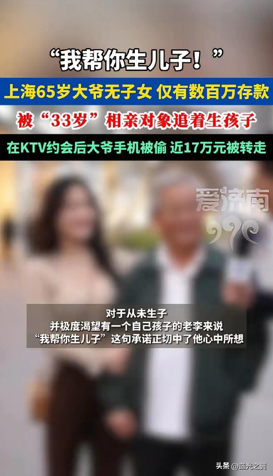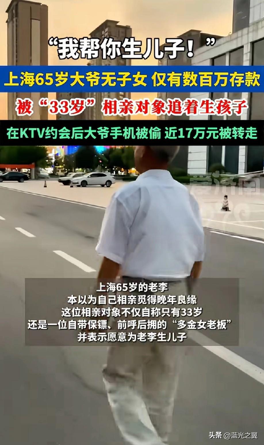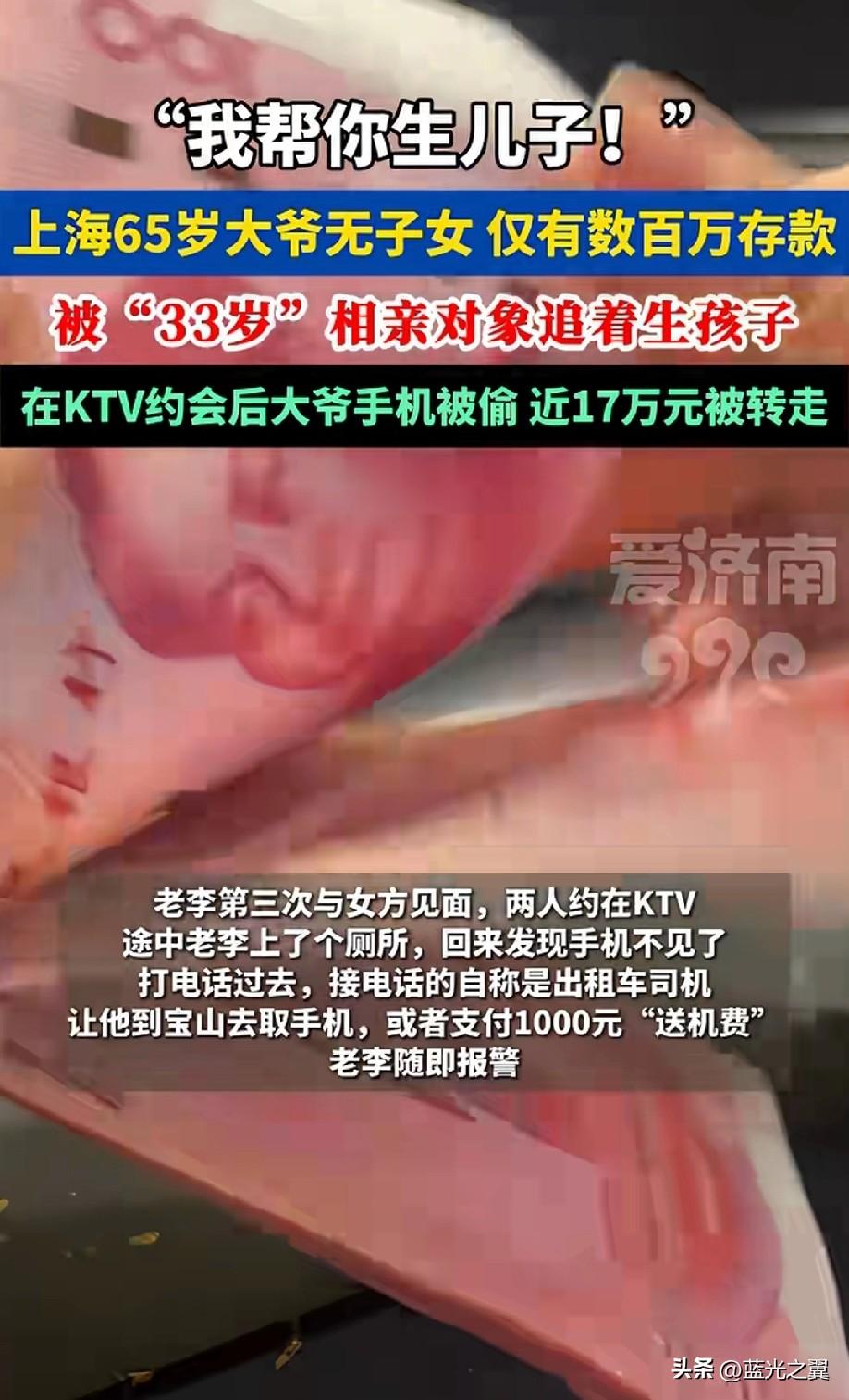 “色字头上一把刀!”上海,一65岁老伯无子女,如今老了想觅得一份晚年缘分,在相亲角认识一名自称“33岁”音乐老师的女子,称“愿意给他生儿子”,老伯便信了。直到自己手机被偷,卡里的16.9万元被转走后,老伯才看清这一切都是女子的骗局! 老李(化名)如今65岁了,离异多年,无儿无女,晚年孤独。像许多独居老人一样,他想找个伴儿共度余生。在相亲角,他“偶遇”了一名自称33岁的女子——陈梅(化名)! 初次见面,陈梅精心设计了一场“偶遇”变“惊艳”的戏码。她乘坐网约车抵达饭店门口时,一名年轻男子快步上前拉开车门,恭敬地称呼她“钱总”! 这一细节让老李印象深刻。在他眼中,眼前这位女子不仅年轻,还是位“多金女老板”——有人伺候,排场不小。尽管陈梅的相貌与33岁的年龄描述存在差距,老李心中虽有疑虑,但对方的“气场”让他选择了相信! 然而,当老李提出要看身份证核实时,陈梅百般推脱。老李心生警惕,果断将其拉黑! 如果故事到此结束,老李不过是经历了一次不愉快的相亲。但一个月后,陈梅换了一个号码再次打来。她没有道歉,没有解释,只说了一句话: “我帮你生儿子。” 这句话精准地击中了老李最柔软的地方。“我没生过孩子,家里没人了,就这一个心愿。”老李后来在报案时这样解释自己为何再次上当! 重新取得信任后,两人第三次见面,约在了一家练歌房! 监控录像显示,当晚老李和陈梅在包间唱歌。点餐付款时,原本各自坐在沙发两头的两人,陈梅总会“自然而然”地凑近老李身边。正是在这个过程中,她记住了老李的支付密码——六个简单的数字“123456”! 趁老李上厕所的间隙,陈梅迅速折返包间,停留一分钟后匆匆离开。老李回来后发现手机不翼而飞,拨打过去,一名自称出租车司机的男子接听,称手机在宝山,要么支付1000元“送机费”,要么自己来取! 老李选择了报警。 但真正的损失才刚刚开始。第二天,老李发现手机绑定的银行卡内16.9万元被连夜转走,收款人正是那个接电话的“出租车司机”——一个叫刘源(化名)的男子! 原来,手机只是幌子,银行卡里的积蓄才是真正目标。更让警方吃惊的是,陈梅对老李的家底了如指掌——她知道老李还有300多万元理财即将到期。这些信息,都是此前两人相处时,老李被“套话”泄露的! 警方调查揭开了陈梅的真实面目! 她根本不是什么33岁的音乐老师,而是53岁的无业人员,常年靠招摇撞骗谋生。那个开车门的年轻人,是她花钱雇来撑场面的“道具”——每次三五百元,先后雇佣了十几二十次! 刘源也不是什么出租车司机,而是她的“私人保镖”。当晚两人从练歌房离开后,直奔银行ATM机取现,随后连夜乘网约车逃往江西赣州! 有意思的是,到赣州后,刘源心生贪念,想独吞剩下的钱,竟独自买了火车票返回上海——正好被警方在火车站逮个正着。几天后,陈梅也在上海一家酒店落网! 目前,两人因涉嫌盗窃罪已被黄浦区人民检察院批准逮捕。警方已为老李追回5万多元,挽损工作仍在继续! 老李的16.9万,买来的不是儿子,而是一场深刻的教训。但这份教训不应只由他一个人承担。当一个65岁老人因为“想有个孩子”而被骗走养老钱,暴露的不只是骗子的狡猾,更是整个社会对老年人情感需求的忽视! 所有被骗的情感背后,都站着一个未被满足的灵魂! 愿每一位老人都能被温柔以待——而不是被温柔地欺骗!