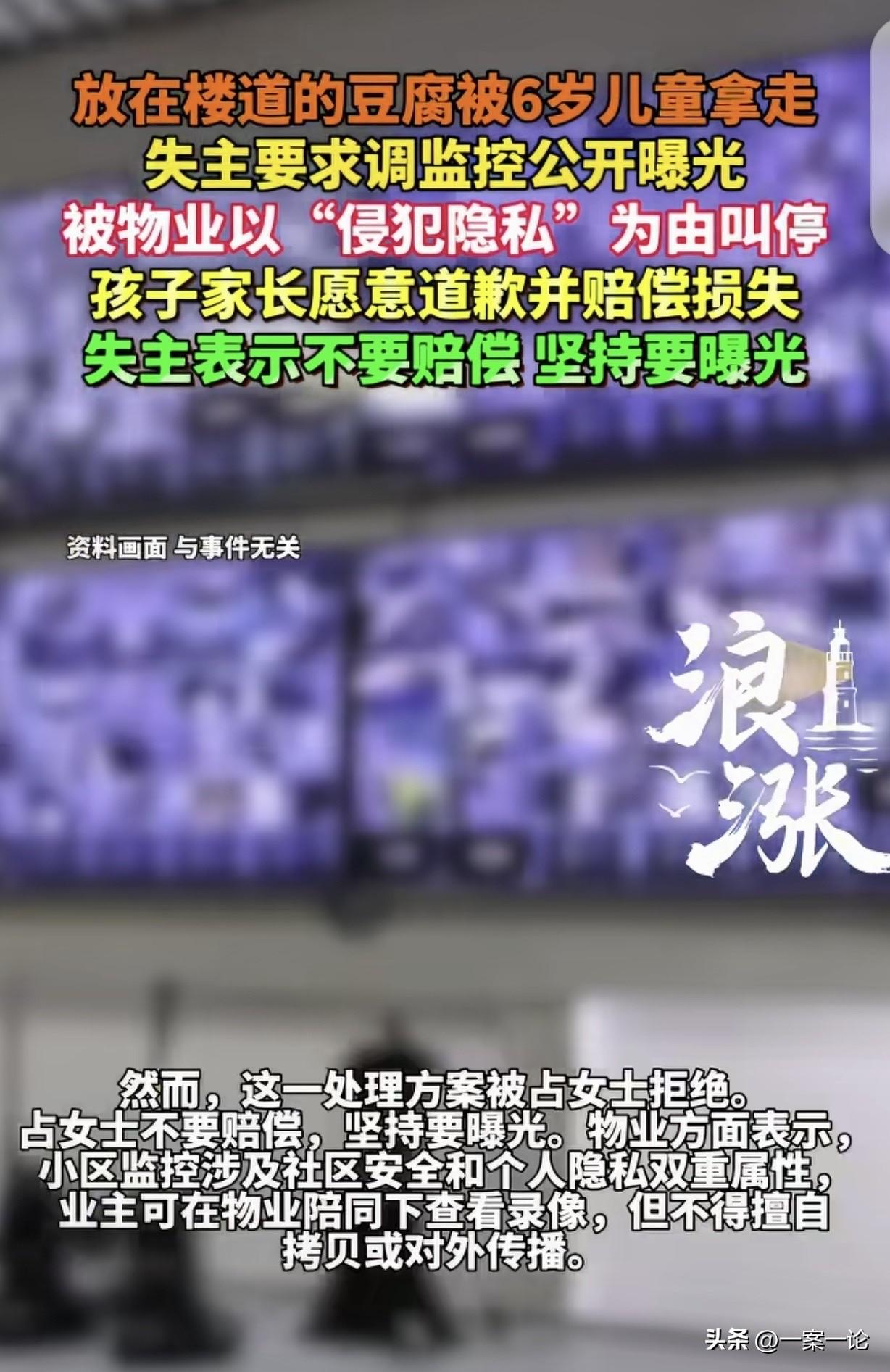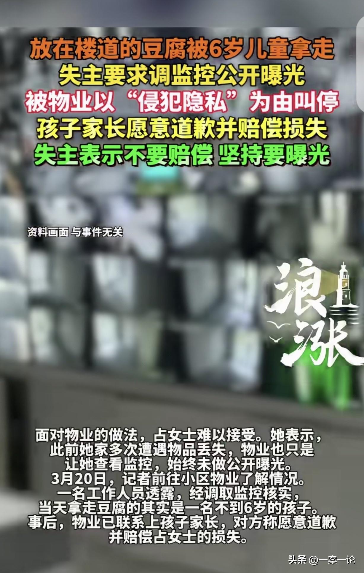 湖北武汉,一女子把一块豆腐,放在楼道几分钟,就被一6岁拿走,摔在便道上,女子大怒,要求物业查监控,把男孩曝光,物业说这侵犯他人隐私拒绝了,让女子去报警,男孩家长愿意道歉,并赔偿女子损失,女子:你家长养不教,我就替你治治这个熊孩子。女子坚持不要赔偿,必须曝光。网友:有必要得理不饶人吗? 占女士在小区里开了家团购店,平日里进进出出的都是邻里,本想着图个安稳营生,却没料到一块豆腐,让她跟物业、邻居闹得不可开交。 3月中旬的一个中午,占女士刚从供货商那儿收了货,手里的活计堆得没处放。 她随手,就把一块装在塑料袋里的豆腐,临时搁在了楼道口的矿泉水箱上。 她想着就转身去店里理个货,顶多几分钟的事儿,不会出岔子。 可等她再出来时,矿泉水箱上空空如也,豆腐没了踪影。 占女士顺着楼道往小区里找,没走几步,就看见那块豆腐被摔在相邻楼栋门口的便道上。 塑料袋破了个大口子,豆腐碎成了几瓣,沾着尘土,根本没法要了。 这一下,占女士的火气“噌”就上来了,不是心疼那几块钱的豆腐,是这事儿实在气人,明摆着是有人故意拿了扔在这儿。 她立马在小区业主群里发了消息,要求物业赶紧调监控,把拿豆腐的人找出来,还得把监控画面公开,让全小区都看看是谁干的。 可物业管家的回复,给占女士泼了盆冷水:物业不是执法部门,不能随便公开监控画面,更不能曝光个人隐私,要是实在气不过,就去报警。 占女士更气了,她想起之前店里好几次丢东西,找物业调监控,物业也是只让她自己看,从来都不曝光。 而如果不曝光,没办法震慑人,她店里丢东西这事就解决不了,以后还会层出不穷。 她非要物业给个说法,没几天,监控查出来了,拿豆腐的是个不到6岁的小男孩,物业很快联系上了孩子家长。 孩子家长知道后,第一时间就跟占女士道歉,还说愿意照价赔偿,哪怕多赔点也行,就希望占女士别再追究。 可占女士一口就拒绝了赔偿,她不是差那点钱,是这孩子家长“养不教”,她必须把孩子的监控画面公开,替家长好好“治治”这个熊孩子,也好让其他家长都长长记性。 后来这事儿在业主群里传开,有的邻居觉得占女士小题大做,一块豆腐而已,孩子还小,犯不上这么较真。 也有人说占女士没错,就该给熊孩子点教训。 可不管别人怎么说,占女士就是咬死了要曝光,物业夹在中间左右为难,这事儿直到现在还没个定论。 占女士的团购店照旧开着,只是每次路过那块豆腐被摔的地方,她还是忍不住生气。 有人说,6岁的话应该是无意的,给人一个机会吧,即使是16岁也应该斟酌一下。 正常情况下,业主不能看监控,怕的就是知道当事人激化矛盾,何况曝光?都是报警,让帽子叔叔从中调解。 还有人认为,6岁小孩?你跟他计较什么?人家又不是去你家偷的,是拿放在外面的。在孩子的认知里,会当成没人要的东西的,事后家长有道歉有教育孩子就行了,咋还不算完了?用得着得理不饶人? 我将针对占女士与6岁男孩的纠纷,结合相关法条进行合规分析与解读。 根据《民法典》第一千零三十二条,自然人享有隐私权,任何组织不得以公开他人隐私等方式侵害权益。本案中,6岁男孩属于无民事行为能力人,其隐私受法律严格保护。物业拒绝曝光监控画面,正是恪守隐私权边界的体现。占女士坚持曝光的诉求虽出于“惩戒熊孩子”的心理,但已涉嫌侵犯未成年人隐私权。 《民法典》第1188条规定,孩子侵权的赔偿责任由家长承担,家长已主动道歉并愿意赔偿,已履行相应责任。 占女士拒绝赔偿执意曝光,既不符合法律对隐私权的保护原则,也超出了合理维权的范畴,反而可能因侵权需承担相应法律责任。 对于这件事,你怎么看? 欢迎关注@一案一论