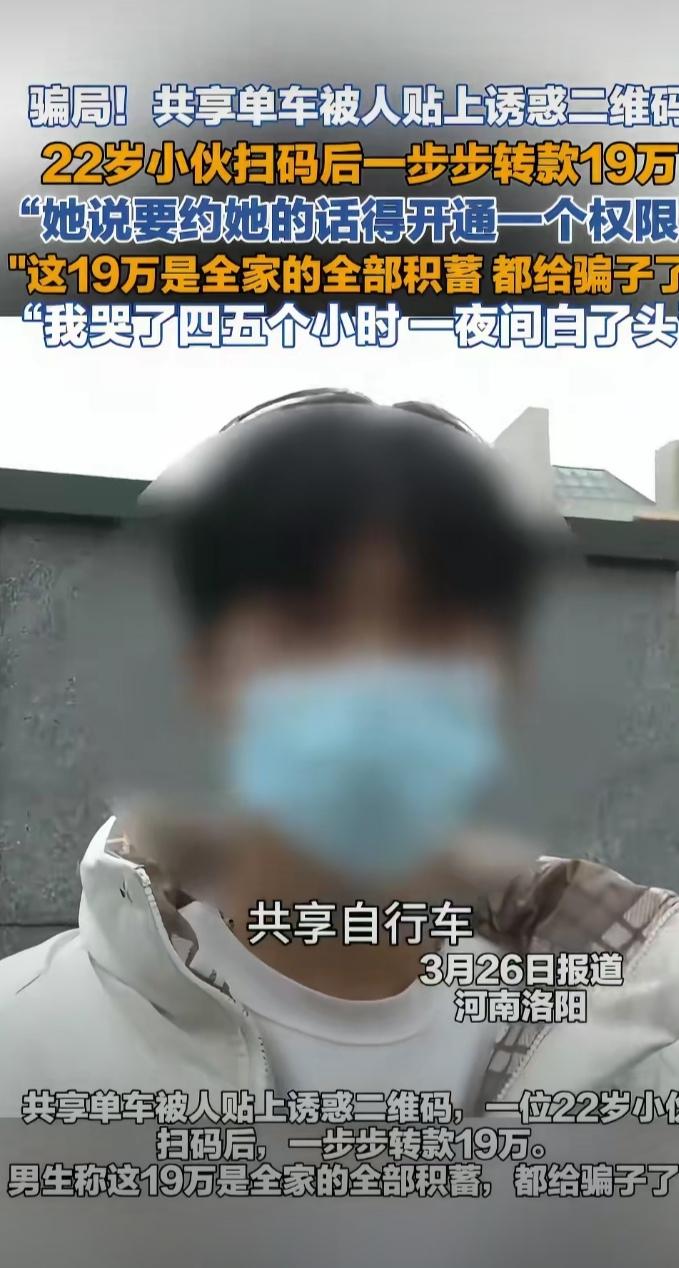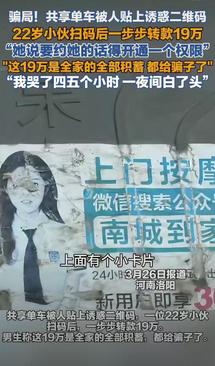 共享单车上的诱惑,让小伙被骗19万! 22岁的洛阳小伙小何,被共享单车上“同城交友”广告吸引,在猎奇心驱使下,扫描广告二维码下载APP,被引导添加微信。 互加微信后,一位“小姑娘”主动发起聊天:“小哥哥,你看下我怎么样,要约我的话,首先需开通权限”,这一声声小哥哥,叫得小伙子心花怒放,无法抵挡,赶紧充值开通了权限。 第一次充值3000元,对方说资料审核未通过,要求再转9000元解冻。这时候,如果脑子保持清醒,停止转账是止损的最佳时机,但是当事人往往不会这么想,如果放弃,之前的3000元就会打水漂,为了把钱拿回来,只得硬着头皮赌一把,这恰好中了骗子设计的圈套。 就这样,骗子不断变换方式,小伙子被对方牵着鼻子走,总希望翻盘他,窟窿却越来越大,很快账户上的12万就见了底。 其实如果小伙子这时候能清醒过来也能将损失降到最低,可这12万是家里省吃俭用准备买房的首付款,没了怎么向家人交待?这时小伙子已经被对方洗脑,在骗子的蛊惑下,竟然使用对方推荐的网贷,陆续转账近7万。结果可想而知,肉包子打狗——有去无回。 卡上的存款没了,网贷也转得干干净净,小伙子再也无钱转账了,骗子知道小伙再也榨不出油水,立刻将小伙拉黑。 这时小伙子终于从迷雾中醒来,但为时已晚,对方早已失联跑路,索回无门。19万对于普通家庭来之不易,小伙子心理彻底崩溃,后悔+恐惧一齐涌上心头,蹲在地上大哭5个小时,小小年纪竟然一夜白了头。最后在家人的陪同下报了警。 提醒大家:所有约会交友明码标价的都是诈骗,做到不扫不明二维码,不转陌生账户;遇到被骗时切勿抱侥幸心理,此时是损失最小的时候。