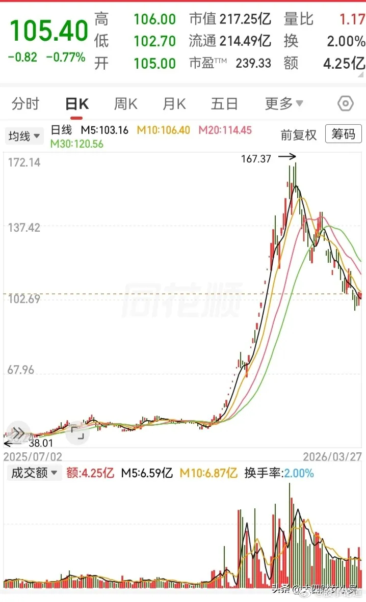 一个st的票,居然能涨到160块,3个月涨了3倍的高度!不过到顶后,主力进行了下杀,走势已被接近腰斩。按这种下行速度,不知能否稳住三位数的位置。这种走势,属于典型的高位下杀走势。一旦走势在高位迟迟上不去,可能会遭遇主力的掉头转空,所以要读懂主力多翻空的动作。通常来说,走势在高位进行多空转变时,会有这两种显著特征。一是技术形态的破位。在走势掉头向下之前,通常会出现一些滞涨、背离的现象。比如,走出一些带上影线的日线,这其实就是多头努力尝试向上突破但失败的迹象。再如,原本支撑走势上行的各个均线开始走平甚至下行,特别是走势连十日线、二十日线都被击穿之时,也就意味着走势中短期趋势的变空了。二是量价关系的失衡。可以明显看到,走势在高位震荡的时候,经常会放出比较巨大的量能,但是位置却不能被有效拉上去,甚至还出现了一定的下滑。这就是量价不对称的迹象,也是主力开始移花接木进行出去的一个动作。因此,一个上涨迅猛的走势,在高位出现了这些特征的时候,就要格外留意小心了,这可能就是主力多翻空的动作。今日看盘股票