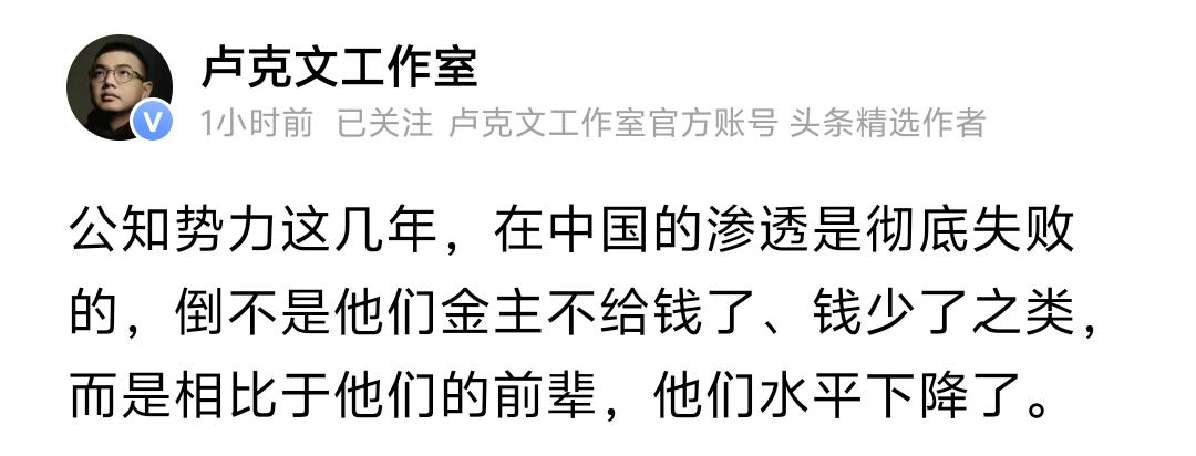 卢克文:公知势力这几年,在中国的渗透是彻底失败的,倒不是他们金主不给钱了、钱少了之类,而是相比于他们的前辈,他们水平下降了。 应该还有这几个原因:一是中国人生活越来越好了,谁还愿意放着称心如意的日子不过整天提心吊胆呢?二是现在是信息时代,也就是他们很难再制造无法验证的幻镜了;三是美西方如今的境况是一言难尽,不说日落西山,也差不多是没落贵族了。 一句话,现在还能被渗透的,要么贪得无厌,要么傻得要死!