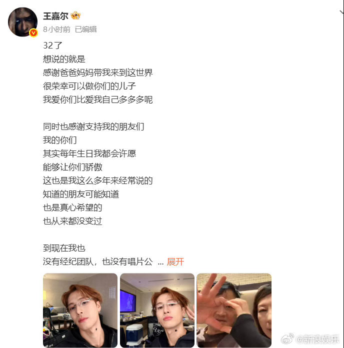 王嘉尔32岁生日长文 28日,王嘉尔在32岁生日当天发文,感恩父母给予自己生命,同时坦言目前没有经纪团队、唱片公司与版权公司,团队也并未十分稳固,“其实说白了,是你们的支持,我才能到现在。”