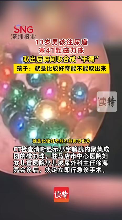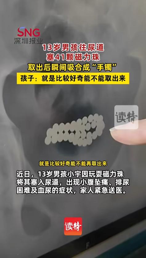 “好奇心害死猫!”近日,河南驻马店,一位13男孩因为好奇,往自己尿道里塞了41颗磁力珠。不久他就出现了排尿困难,甚至血尿的症状,家人紧急送往了医院。经过手术,磁力珠被顺利取出,瞬间就吸合成了一条。网友:青春期可得多操点心! 据媒体3月26日报道,男孩正值青春期,突然间好奇,想试试磁力珠塞进尿道还能不能出来。就这样,他陆续给自己塞了41颗。结果很悲催,进去容易出来难。 不久之后,男孩就出现了不适症状,开始排尿困难,小腹坠痛,后来还出现了血尿。家长知道后,赶紧带他去了医院。 医生通过检查,发现磁力珠在膀胱内聚成了一团,经过研判后,决定立即进行手术。两个小时后,这41颗磁力珠终于被一颗颗取了出来。由于磁力太强,放在盘子里给家长看时,直接聚合成了一串。 术后,男孩又做了一些治疗,终于恢复了健康,顺利出院。 青春期的孩子好动,经常有往尿道里面塞东西的,除了磁力珠,他们还见过铁钉,体温计等东西。这个年纪,家长们一定要多加关注,做好引导。毕竟东西一旦塞进去,对孩子的健康危害极大。 网友看后表示,当家长不容易,得有耐心,得时时关心,在孩子成长的阶段,一不注意就会闹出些大麻烦。不过,这也不正是家长的责任么,咱们小的时候,不也是这么被带大的么? 信息来源:《【13岁男孩因好奇往尿道塞41颗磁力珠】 取出后瞬间吸合成“手镯”。》深圳新闻网