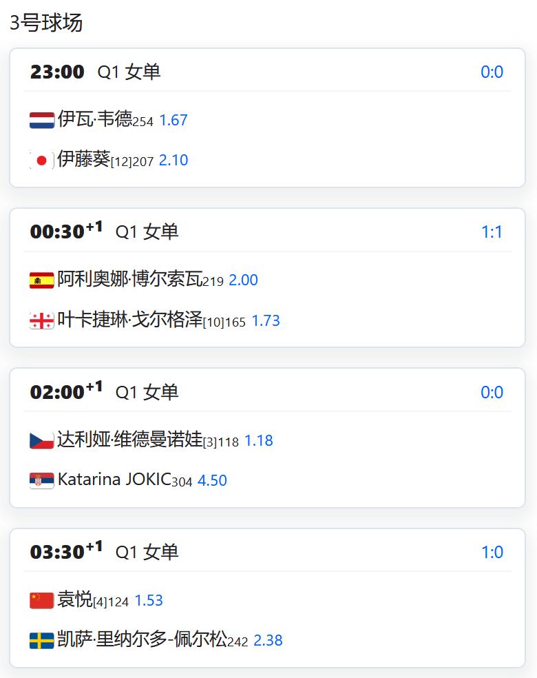 WTA1000赛迈阿密站,女双半决赛,张帅/梅尔滕斯在首盘1-2落后时,因梅尔滕斯身体不适退赛; CH50四日市,男双决赛,孙发京/吴东霖7-6(6),6-3击败澳洲组合夺得冠军; W50马鞍山,女单半决赛,郭涵煜在先丢一盘的情况下2-1逆转谢尔班,晋级决赛。 赛程: WTA500赛查尔斯顿站,女单资格赛第一轮,袁悦以4号种子出战,对阵瑞典球员佩尔松。