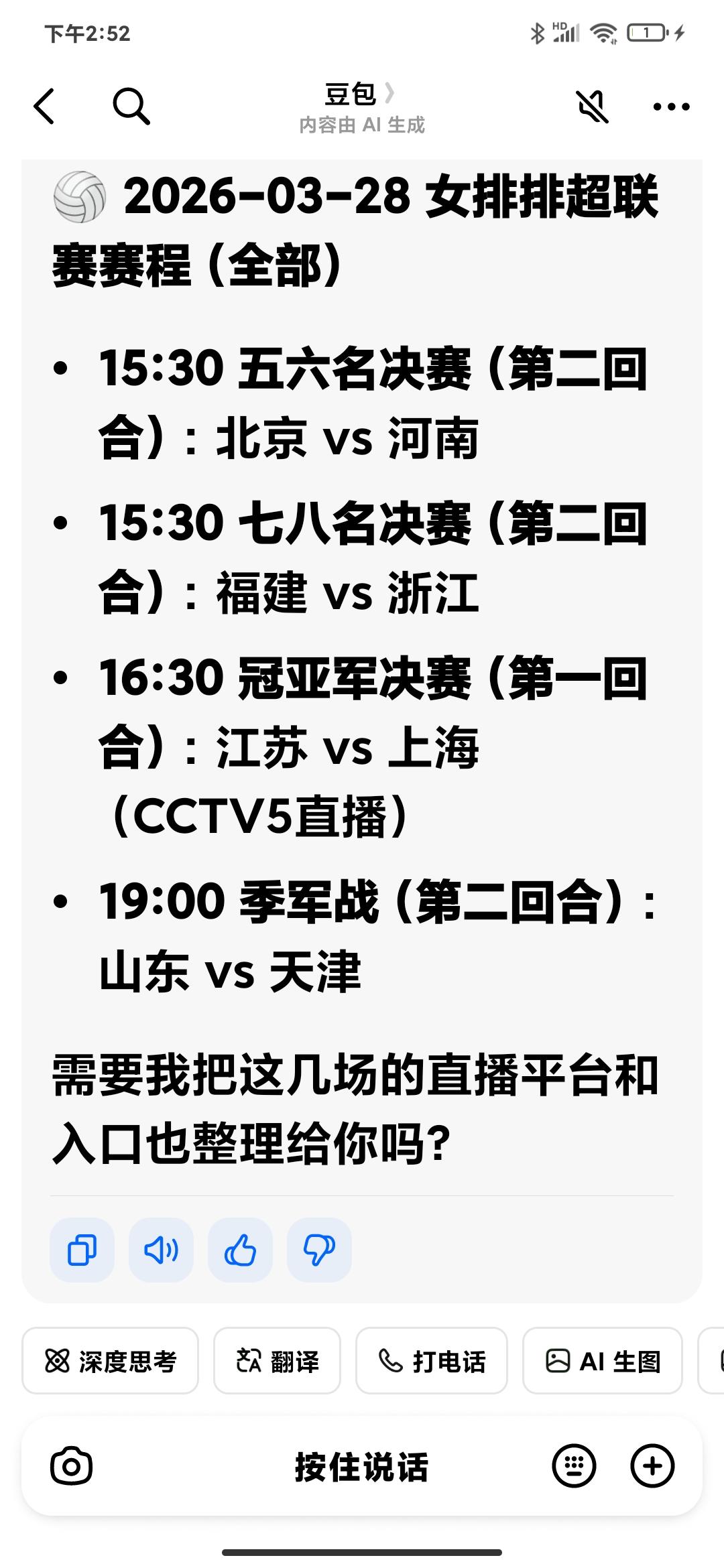 [玫瑰][碰拳][加油]今日(3月28日)女排4场对决时间变來变去,但最终确定下來了(图6),请球迷朋友准时搜索平台直播信号观看。 今日重头戏是上海女排VS江苏女排的冠军爭夺战,央视CCTV体育台予以直播。 另天津女排第2回合客场VS山东女排铜牌战,值得关注,请届时搜索平台直播信号观战。