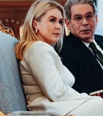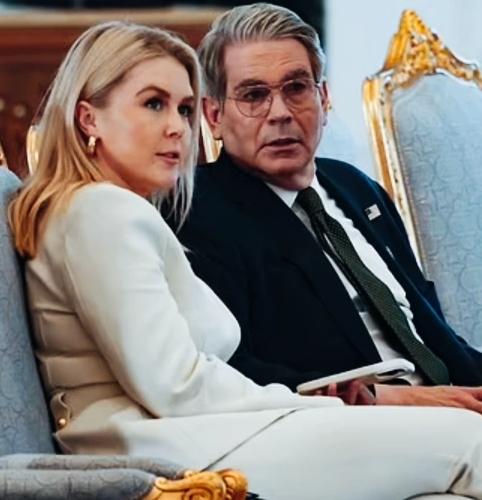 卡洛琳和贝森特两人看向同一个方向,在目不转睛看什么呢? 什么事情让他们看的这么聚精会神的投入啊? 卡洛琳和贝森特是不是在认真听他们的领导特朗普讲话啊?