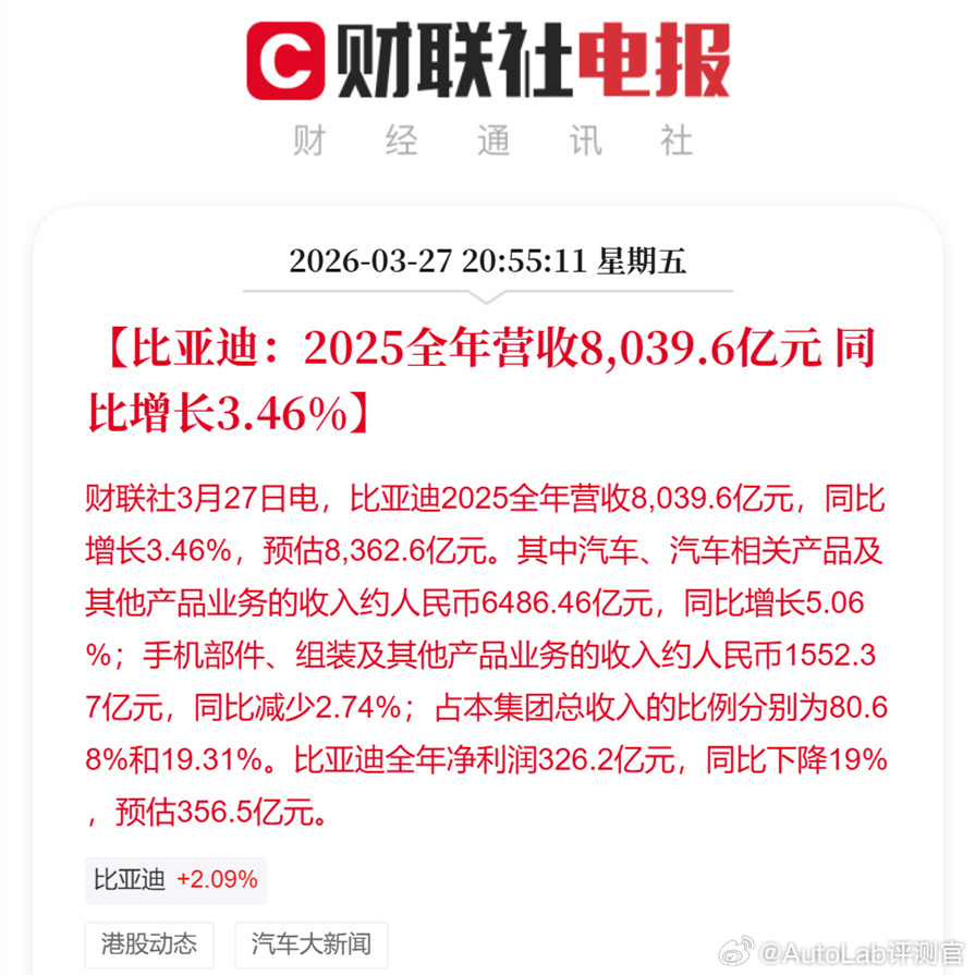 比亚迪公布了2025年的财报,全年营收超8000亿,同比增长3.46%,但净利润有所下降