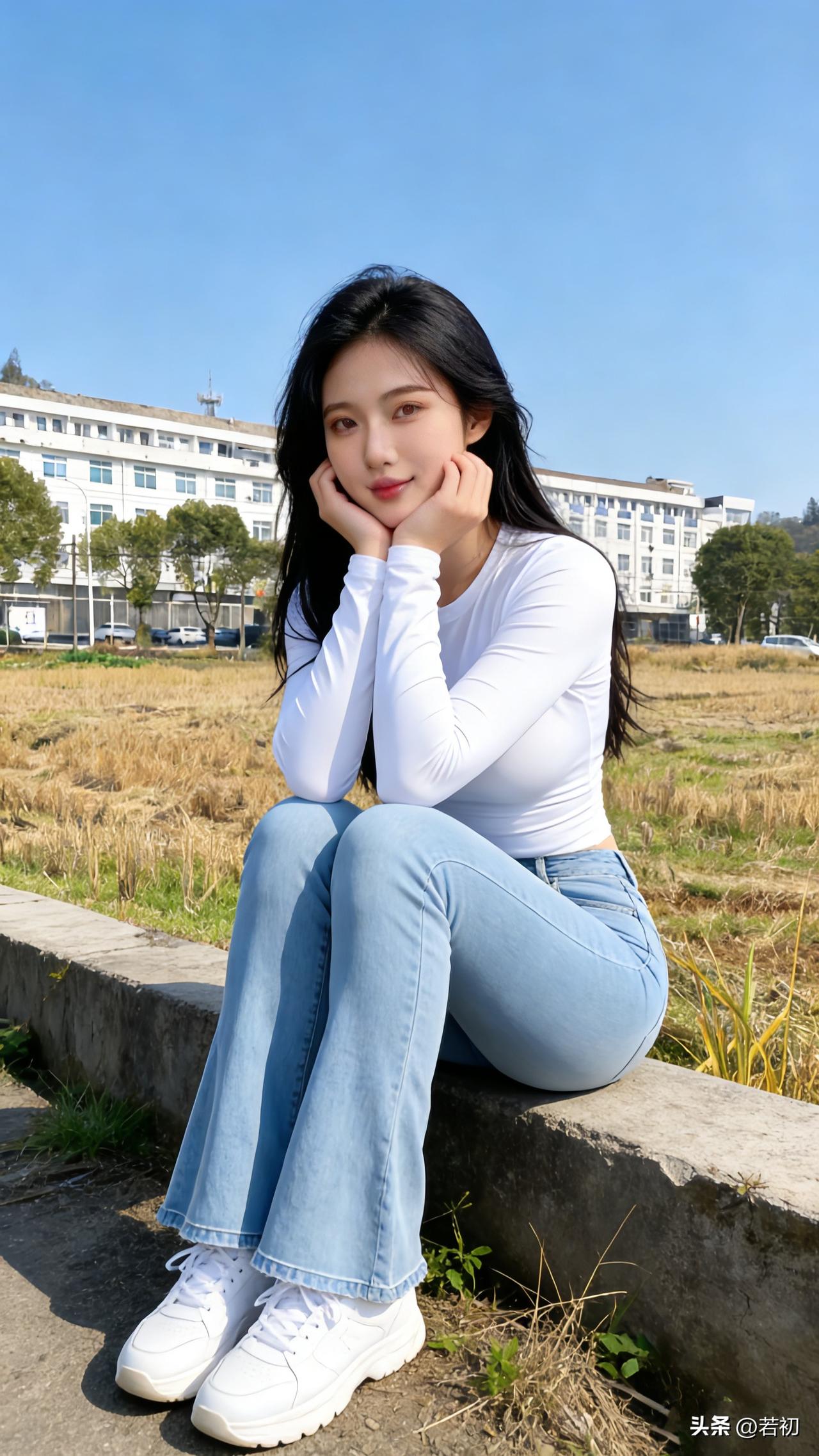 夏日田野漫步,牛仔裤与白T恤的清新搭配,轻松自在。🌾👗👟