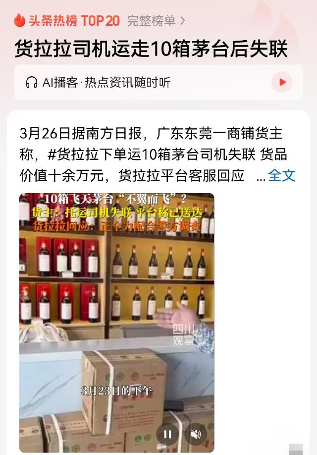 广东东莞一老板,找货拉拉运10箱2000年的老飞天茅台去广州,那可是价值十几万的心头肉。结果酒一上车,司机就玩起了消失,老板急得抓瞎。找客服询问,对方竟然淡定地说“货早送到了”。等老板想要司机的联系方式时,客服却拿司机的隐私当挡箭牌,死活不给。这摆明了就是一出荒诞剧,十几万的真金白银上了车,怎么就成了一道连平台都解不开的送命题? 要知道,这可不是小卖部里几十块钱的口粮酒,这是整整10箱千禧年出厂的“老飞天”。对于懂行的烟酒行老板来说,这年份的茅台就是镇店的“定海神针”,价值少说十几万起步。3月23号下午,广州那边的客户催得紧,老板亲自盯着工人把这批响当当的硬货搬进货运车厢。门一关,油门一轰,老板以为做成了笔大买卖,谁能想到,这竟成了他深陷泥潭的开始。 从东莞直奔广州,走高速也就六七十公里的路,撑死了一个半小时就能到。可广州的收货方左等右等,足足熬了三个多小时,愣是连个酒瓶子的影儿都没瞧见。老板开始慌了,通过平台的虚拟号码不断呼叫司机,传来的全是令人绝望的“嘟嘟”盲音。一个在商海沉浮多年的大老爷们,此刻看着空荡荡的接货点,急得差点当场泪崩。这就好比你把全部身家交给了押镖的趟子手,结果趟子手带着镖车凭空在人间蒸发了。 老板火冒三丈,第一时间拨通了货拉拉的客服热线。可平台接下来的操作,更是绝了。电话那头的客服慢条斯理查了半天,轻飘飘地丢出一句:后台显示货物早就安全送达了。老板一听脑子嗡地一声,跟收货方反复确认,对方咬死绝对没见到货。一来二去,老板要求平台立刻交出司机的真实手机号去寻人。谁知平台十分硬气,直接祭出“保护司机隐私”的大旗,四两拨千斤地把老板生生堵了回去。 让人无比唏嘘的是,出事后的23号和24号,本该是排查寻人的“黄金48小时”。可这家货运平台却表现得事不关己,自始至终连一个主动核实的电话都没打过。这种得寸进尺的敷衍态度,彻底击碎了老板的最后一点耐心。眼看这10箱老酒就像跌进了黑洞,老板毫不犹豫,一头扎进东莞当地派出所,把立案回执拍在了平台的桌面上。直到警察的电话打过去,平台这才像挤牙膏似的吐露了实情:原来,他们自己也联系不上这名司机了。 不仅如此,随着警方的介入,这笔订单背后的潜规则也被扒了个底朝天。这单子压根不是货拉拉内部核心运力消化的,而是被甩手丢进了合作方“小拉出行”的共享池里。至于客服此前所谓的“已送达”,纯粹是业务不精,把相隔一个小时的另一个同类订单看串了眼。一条跨越双城的运输线,十几万的高附加值订单,最后竟然沦为没有任何实质性预警机制的“法外之地”。 话说回来,咱们掰开揉碎了,用法律和逻辑的视角来看看这起迷案。现在是法治社会,处处都是天眼探头,这司机要是真敢见财起意卷包会,那智商简直让人捉急。根据我国《刑法》第二百七十条的明文规定:将代为保管的他人财物非法占为己有,数额较大拒不退还的,直接入刑。这批老飞天价值十几万,妥妥触及了“数额巨大”的红线。这就意味着,如果司机存心私吞,等待他的将是三年起步的铁窗泪,且必须连本带利把赃物吐出来。 当然,这事儿也有另一种极其微小的可能,那就是司机在半道上遭遇了不可控的突发状况。根据《民法典》第八百三十二条,如果是遇到了地震、洪灾这种人类无法反抗的“不可抗力”,司机确实可以免责。但广东那两天风平浪静,何来天灾?如果是因为司机疲劳驾驶或者分神,一头栽进沟里把这十几万的茅台摔成了玻璃渣,那对不起,哪怕砸锅卖铁,这笔巨额赔偿你也得照单全收。 看着这出充满戏剧性的悬疑剧,我的心里满是五味杂陈。在这个一键下单、万物皆可托付的同城货运时代,大平台用算法把调车效率拉到了极致,却把最底线的“托付与信任”踩成了碎渣。你既然收了抽成、赚了信息差的钱,就必须得套上监管的枷锁,负起托底的责。出了事拿“隐私”打马虎眼,事后靠“不知情”推诿扯皮,这无疑是在砸自己的招牌。最后我想问问大伙,这消失在茫茫夜色中的10箱千禧年茅台,究竟是人性的贪婪作祟,还是命运开的恶劣玩笑?