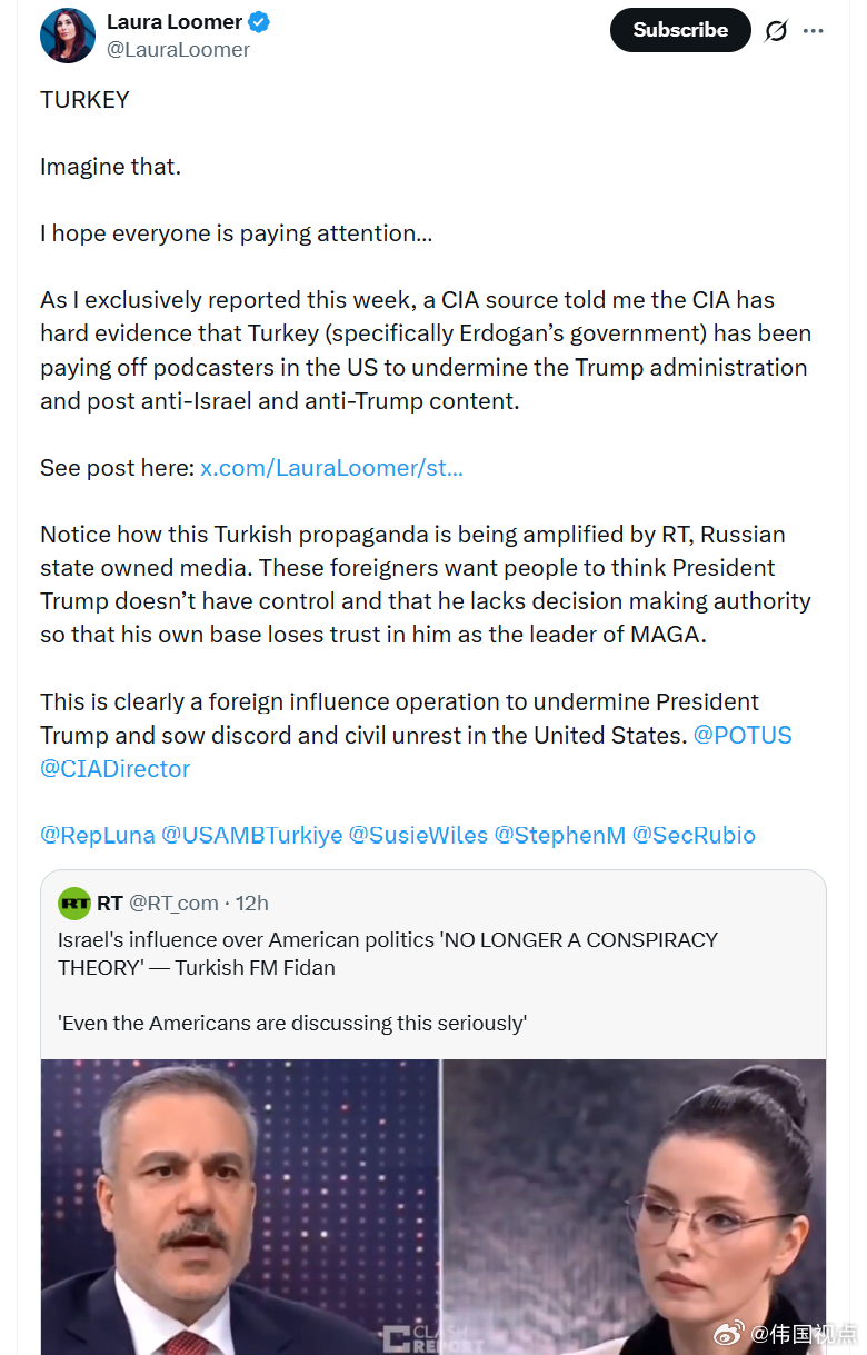 注意这种土耳其宣传是如何被今日俄罗斯(俄罗斯国家拥有的媒体)放大的。这些外国势力希望让人们认为特朗普总统无法掌控局势、缺乏决策权,从而让他的基本盘对他作为“MAGA”运动岭导者失去信任。