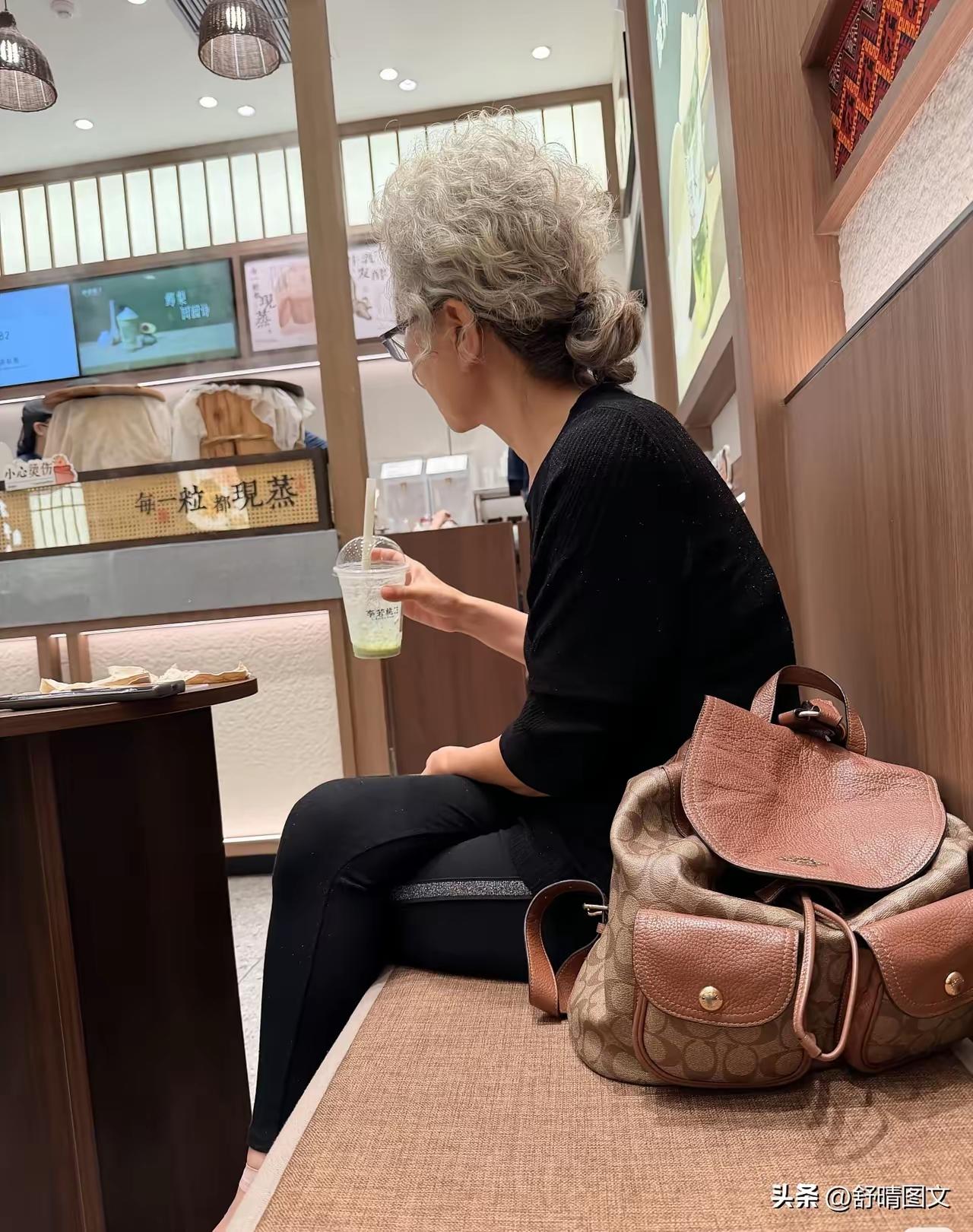 不得不佩服,气质是骨子里就是的,这是我见过最有气质,最时尚的老奶奶。 首先,她虽一头银发,却没有剪成短发,而是把银发烫成卷发,还扎起了小马尾,显得既洋气又显气质。 其次,她没有像普通大妈一样穿的花里胡哨,而是一身黑色装扮,显得素雅又自在。 再者,她身材纤细轻盈,背部又薄又挺拔,这也是气质的体现。此外,她手拿饮品和旁边的包包都彰显她的时尚与品味。