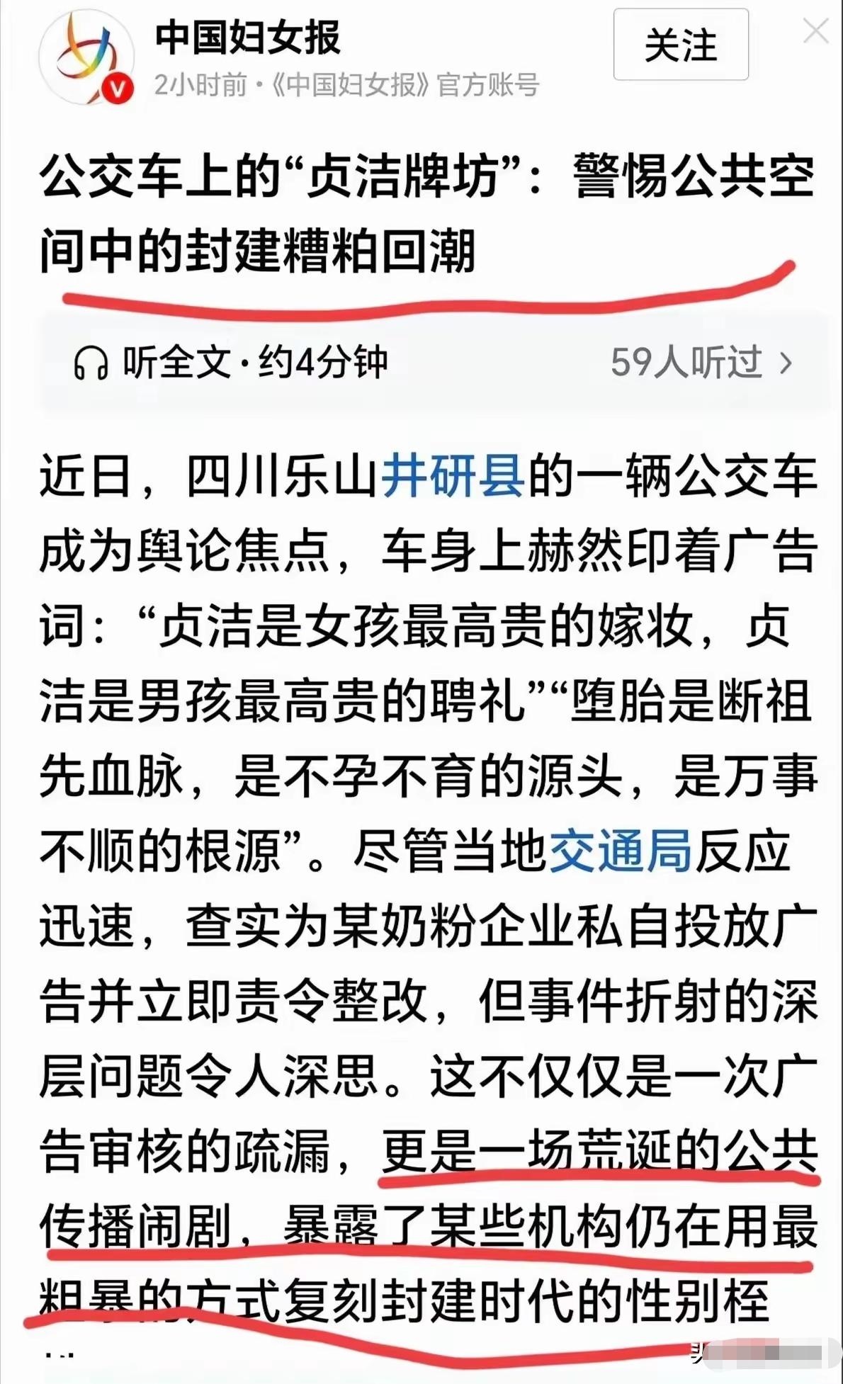 贞洁,到底是不是封建糟粕?该不该提倡?提倡贞洁就是破坏女权? 近日,乐山公交几句关于“贞洁”的广告引发广泛关注和热议,持续网络发酵。 到现在,包括《中国妇女报》在内,至少有10家官方媒体下场批评,直指此广告是封建糟粕,有些言辞还挺严肃,跳的比较高,看来是很收到了很大的刺激。 讲贞洁不对么?我突然感到很困惑,有点不理解,是这些媒体“进步”太快了?还是我们老百姓跟不上节奏,听不懂他们说话啦? 谈及贞洁,有些人会直接将其与封建糟粕划等号,认为提倡贞洁就是固守封建思想。这种看法实际是陷入了片面认知的误区。贞洁本身并非糟粕,被扭曲的封建贞洁观,才是需要摒弃的对象。 封建时代的贞洁观,是对女性的单方面严苛束缚。它将贞洁等同于女性的全部价值,甚至衍生出“饿死事小,失节事大”的极端论调,完全剥夺了女性的情感自由与人格独立,这种压迫性、不平等的贞洁观是封建糟粕,理应被抛弃。 现代意义上的贞洁,早已脱离了封建枷锁,它指的是个人对情感、身体的尊重与坚守,是一种自主的道德选择,而非外界强加的束缚。它不分性别,强调在亲密关系中保持忠诚,对自己和爱人负责,拒绝随意放纵与背叛,这是对自我尊严的维护,也是健康情感关系的基础。 现在,我们不该盲目提倡封建式的贞洁,但同样不能全盘否定贞洁的内涵,将尊重自我、忠于感情的理性坚守视为落后。 长期以来,在西方文化无孔不入的侵蚀下,国内已经初步形成了一种女权主义的氛围,把传统文化中对女人的品德要求视为封建枷锁,打着思想解放的旗号,搞全面“松绑”,抛弃一切约束,由此产生的严重后果开始不同程度地显现。 但是,乐山公交广告恰恰强调男女平等,强调了贞洁对双方的共同约束和意义。 所以,回过头来看,乐山公交广告说错了么?没有! 那么,就不得不思考一个问题:这么多的媒体口诛笔伐,普通老百姓则一片叫好点赞,如此撕裂的认知,是不是反映出了深层次的问题? 总之,封建贞洁观是压迫女性的糟粕,必须彻底抛弃;现代贞洁观是理性的责任与尊重,值得正向引导。二者本质不同,绝不能以“封建”二字一概否定。有些媒体是不是得反思一下啊?贞操不可逆 女性独立价值观 女性独立价值观 贞节女 女性气节 贞爱宣言