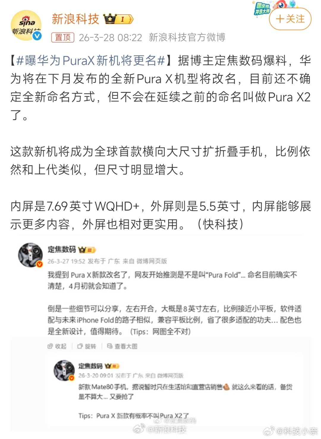 曝华为PuraX新机将更名 具体叫什么其实不重要,重要的是这场阔折叠大战即将打响,而华为在折叠屏方面已经有这么多的经验积累,胜率还是非常高的!