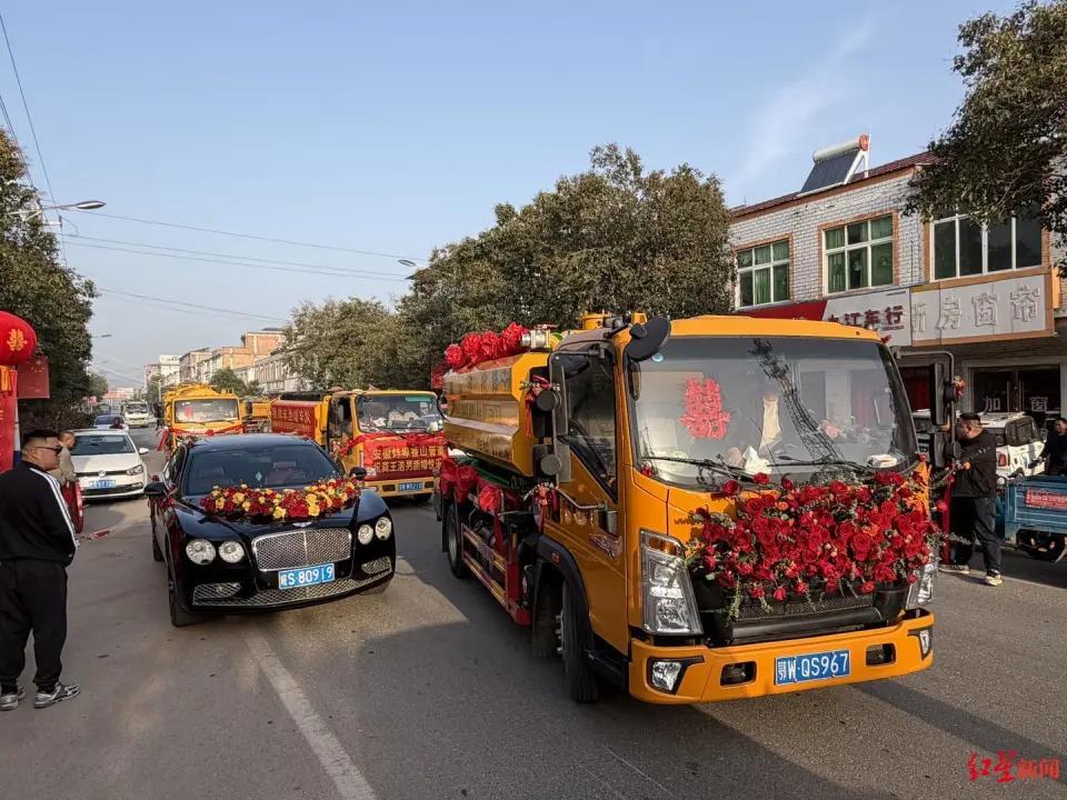 别再追捧豪车婚队!95后“掏二代”吸粪车迎亲,尽显劳动者荣光 世俗眼中的婚礼标配,难道只有豪车撑场才算体面?安徽淮北一场别样婚礼,彻底击碎刻板偏见,尽显平凡人的赤诚与骄傲。 (个人观点仅供参考,无任何不良引导) 3月28日,安徽濉溪县五沟镇街头,一支特殊婚车队引得路人驻足围观。95后小伙潘浩男,身为子承父业的“掏二代”,摒弃世俗浮华,用9辆洁净锃亮的吸粪车,搭配6辆常规轿车,组建专属婚队。车身缠绕红绸,车头点缀鲜妍花束,喜庆横幅迎风舒展,阵势别致又亮眼。全国各地同行心怀热忱,千里奔赴到场祝贺,为这场质朴婚礼添满温情。 潘浩男扎根本职,勤恳务实,不避讳自身职业,不艳羡他人奢华。以谋生工具装点人生喜事,尽显坦荡胸襟。新娘李女士从容大方,坦然回应外界议论,满眼皆是对新郎的认可与爱意。不重物质排场,只重真心相守,这般爱情纯粹又珍贵。潘浩男直言,这场婚礼是爱情见证,更是劳动者的尊严宣言,靠双手打拼,凭本事谋生,每一份职业都值得敬重。 常言道三百六十行,行行出状元。职业无贵贱,劳动最光荣。摒弃虚荣,坚守本心,踏实过日子,真诚待爱人,便是世间最动人的幸福。这场无豪车相伴的婚礼,胜过无数奢华场面,值得所有人由衷点赞。