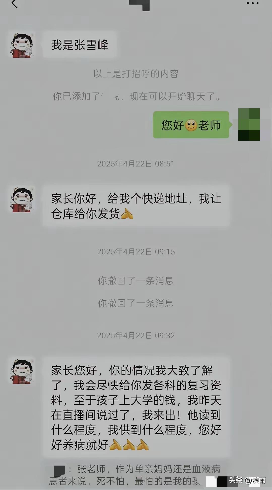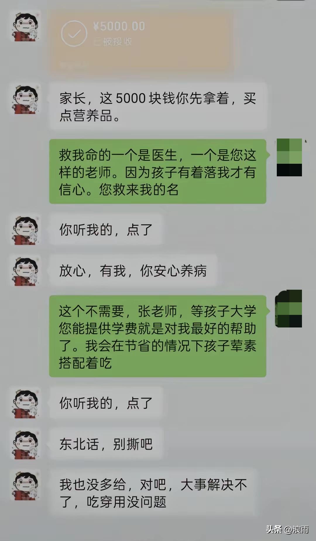 这是去年4月份张雪峰和一位家长的聊天记录。 满满的都是让人感动。 这位重病缠身的家长,只是在张雪峰的直播间里说了一下自己比较困难,没想到张雪峰就主动添加她了。 先是给孩子邮寄学习资料,又承诺孩子的大学学费全包。 然后给了家长5000元,让她买点营养品。 最后还不忘照顾家长的自尊心。 而这也只是他帮助过的众多人中的之一。 一句“别撕吧”,就是张雪峰的真实性格,直爽,纯粹。