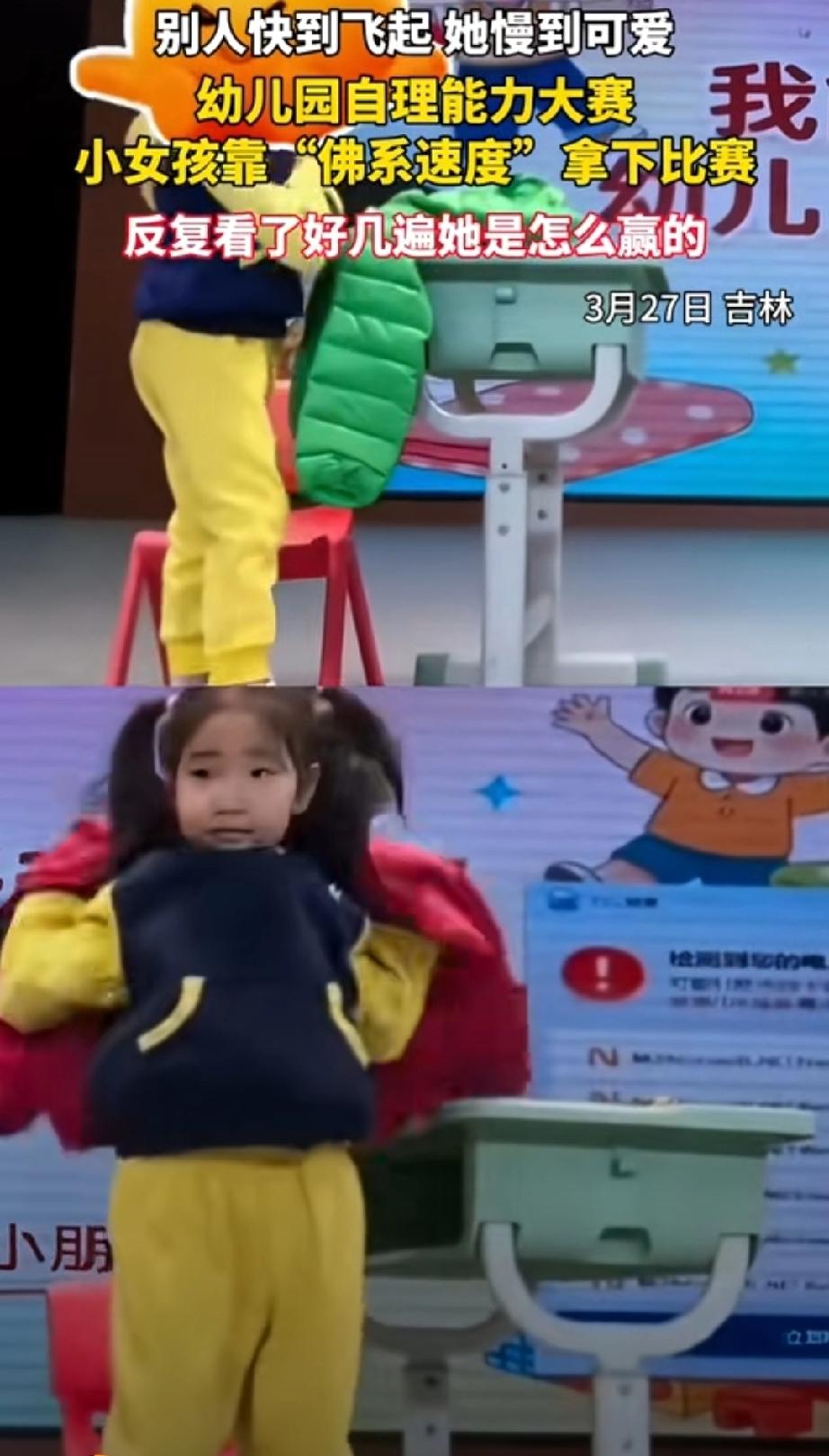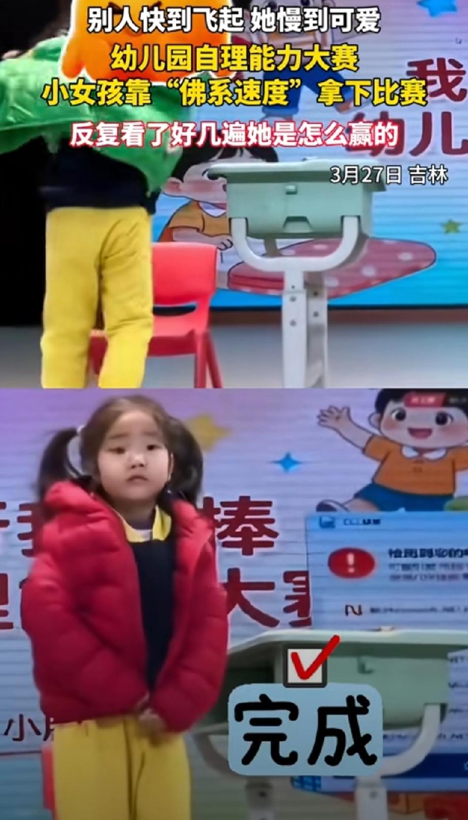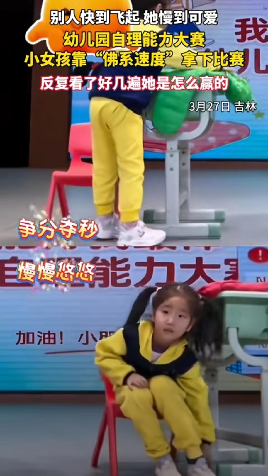 3月27日,吉林。幼儿园举行自理能力大赛,看谁穿衣服又快又好。比赛分穿裤子、穿鞋子和穿衣服三个项目。 绿方和红方展开了角逐。绿方求胜心切,争分夺秒完成每一个动作。飞快的穿上了裤子,又完成了穿鞋两个项目,接着开始穿衣服。处于领先地位。 此时的红方,还在穿鞋,但没受红方的领先影响。仍然坚持自己的节奏,不紧不慢的扎扎实实完成每一个动作。 绿方动作虽快,但在穿衣服时,袖口没处理好,只得花时间整理。待理顺后再穿衣服时,红方已经顺利完成任务。红方获胜。 欲速则不达,老祖宗给我们总结了很好的经验。急于求成往往会忽视细节,结果又要花费大量时间来处理,反而拖慢了进度。培养孩子重要的是,要保持从容,稳定心态,不慌不忙注意细节,有利于把事情做好。 幼儿园比赛小女孩靠佛系速度获胜幼儿自理训练 培养孩子