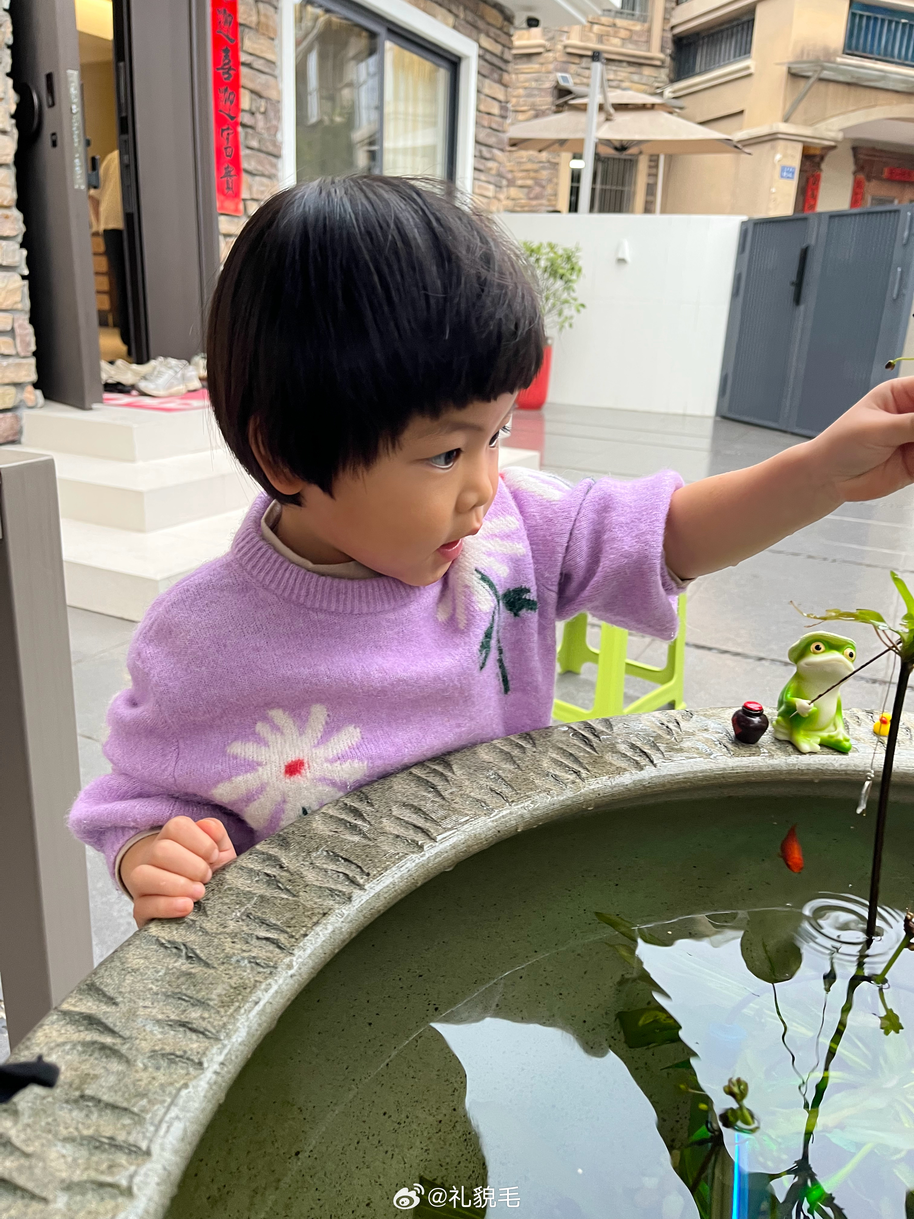 下雨了,球坚持要在院子里剪头于是压压爷爷撑起了雨伞球又说要钓鱼我大舅把鱼抓出来放