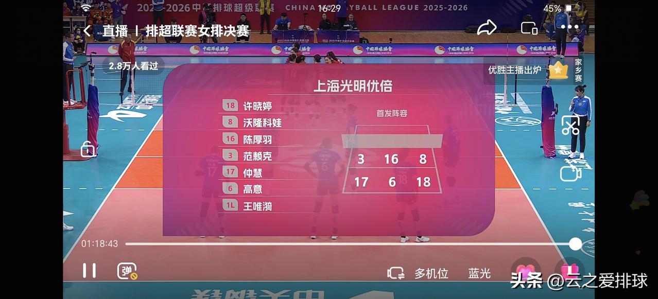 江苏女排抱着冲的姿态,反而释放自己超爆的能量。在决赛首回合先下一城,3:0脆胜上海。 继半决赛战胜天津后,一路高歌猛进,今天完全打嗨了! 唐欣扣球爆杀; 周页彤凭借频频打手出界,前两局2号位起了有效牵扯; 万梓玥也打了2个漂亮的背飞 …… 总之一句话:江苏完全实现了进攻多点开花! 而且在发接发上要明显好于上海。 今天上海的一传好的时候不多,不是仲慧飞,就是沃隆飞!赵哲熙和黄悦鑫前后替补上场后,依然如此。小将上场后后排防守更是大漏洞! 除了一传,仲和沃的状态进攻状态也很一般! 也就范赖克进攻还在点状态,但是发球也频频失误。 上海光明优倍给我的感觉,几乎全场梦游! 另外7、8名之战,福建女排在金局没有顶住浙江西塘古镇,要打升降级战了! 5—8最终排名: 北京北冰洋 第5 河南双汇 第6 浙江西塘 第7 福建安溪铁观音 第8