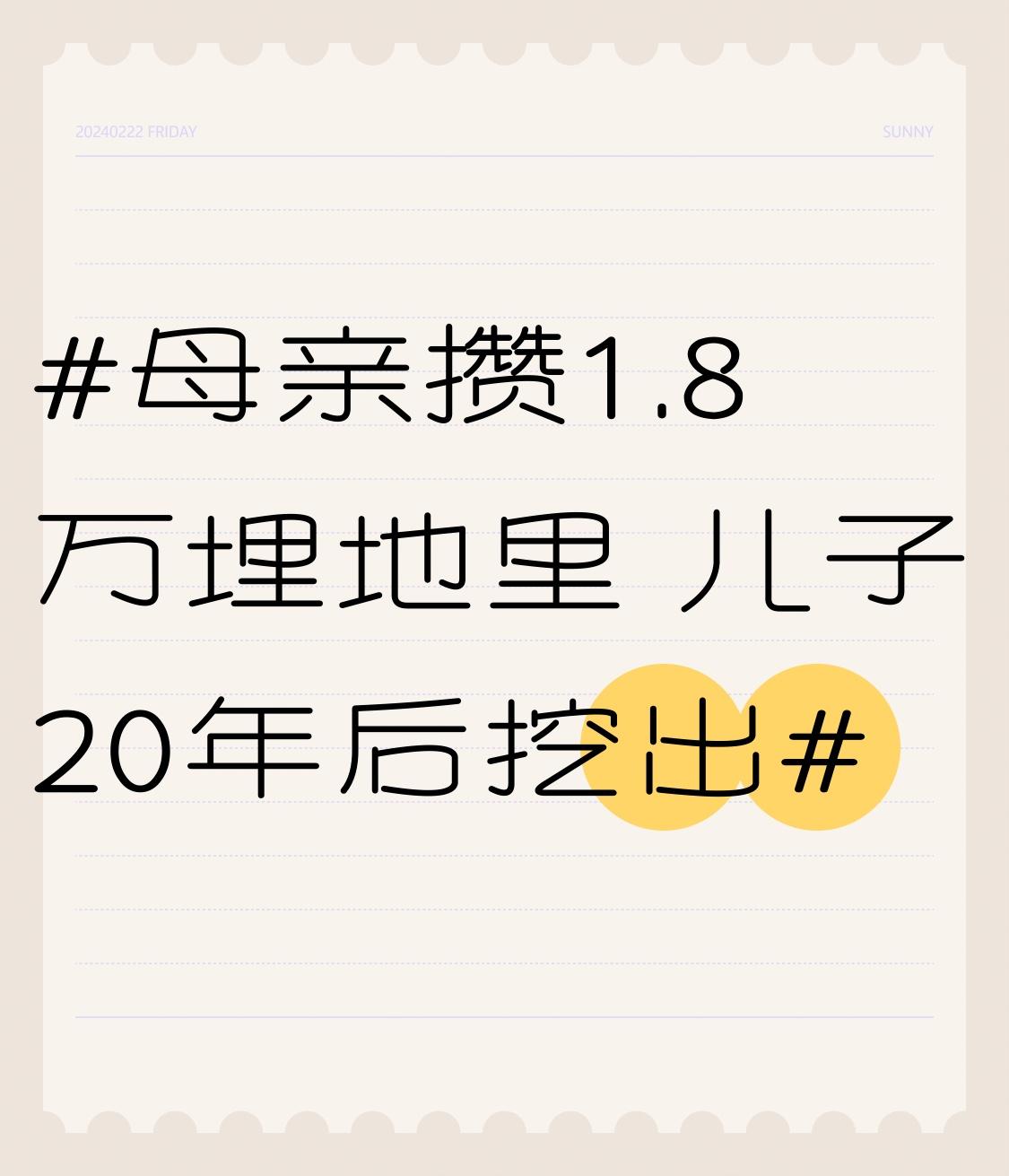 母亲攒1.8万埋地里 儿子20年后挖出 3月27日河南三门峡的郭先生,拆老宅时挖出个“时光胶囊”——母亲20多年前攒的18000余元。当年母亲靠种地卖粮、喂猪养羊,一分一厘才攒下这笔钱。60岁时母亲突发脑梗,记忆模糊忘了这事,全家搬去城里,一晃20多年。现在老人身体好转,只记得有存款却想不起藏哪。郭先生一开始高兴,后来就忍不住流泪。他说父母健在,这笔钱完璧归赵。这不仅是钱,更是母亲多年的心血,郭先生的做法也让人看到了孝顺。