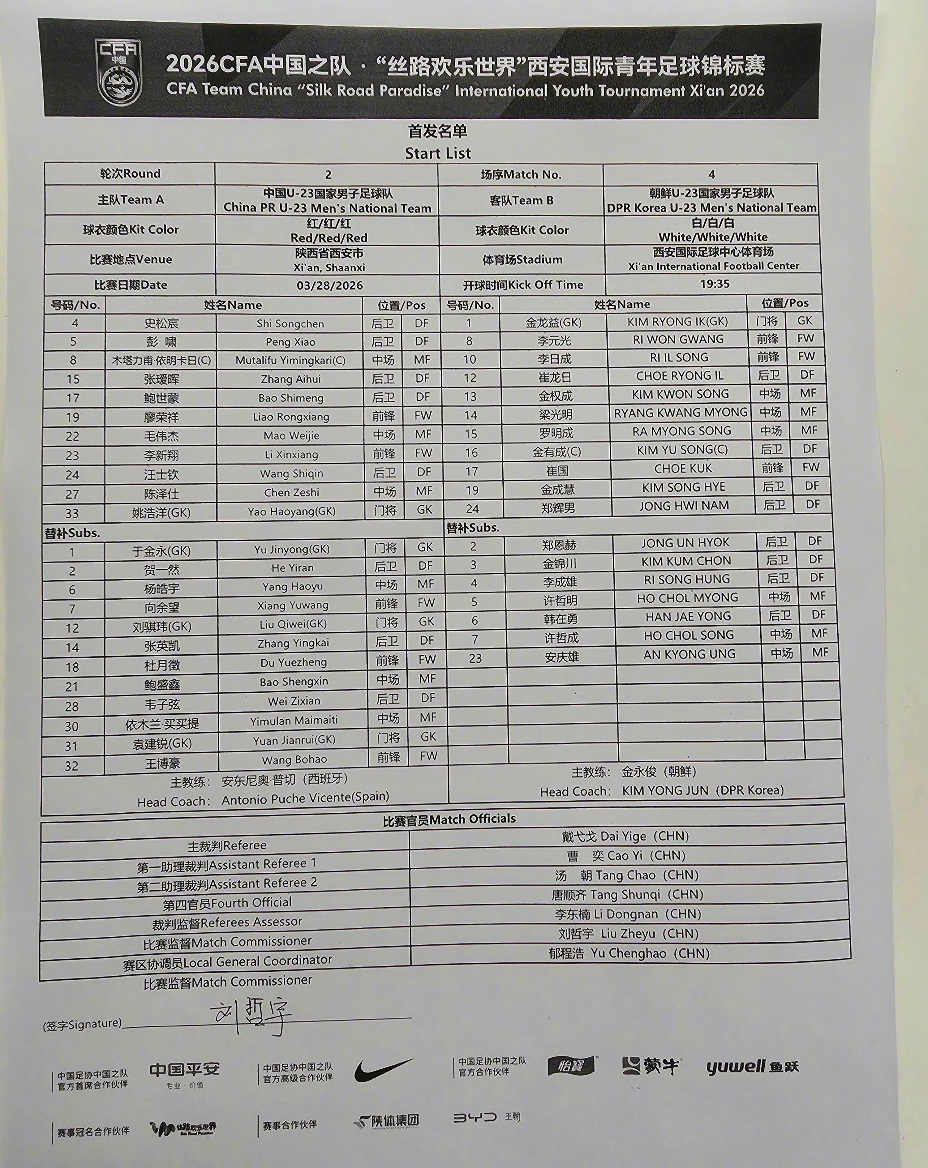 中国之队邀请赛西安赛第2轮,U23国足对阵朝鲜U23。赛前首发公布。本场比赛玄智健红牌停赛,姚浩洋、毛伟杰、李新翔先发,于金永、王博豪还有此前发挥出色的向余望替补。不知道,这次安东尼奥要下什么棋呢?国足