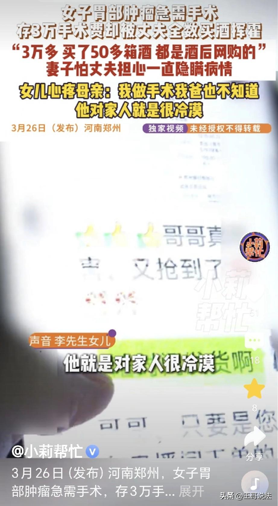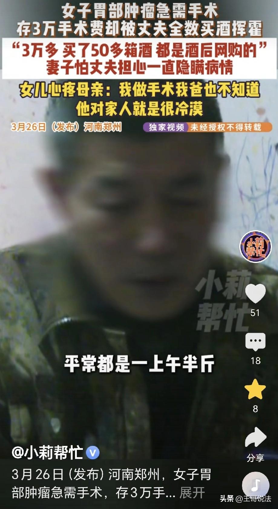 “这男人是来催命的!”河南郑州,一女子胃长了肿瘤,和医生约好要做手术,她回家拿钱缴费,发现丈夫把她治病用的30000元全部买成了53白酒,妻子大哭: 不做手术就是等死,你还想要我活不活了?丈夫: 我不知道那是手术费,没人跟我说,我平常就上午半斤酒,下午半斤酒……女子要退酒,却找不到退酒渠道。 女子身体不适,到医院一查,发现 胃里长了个肿瘤。 女子急了,哭天抹泪,她还有个女儿,让她怎么舍得去死? 医生安慰她说,会给她安排手术,尽快的治疗,就能让她尽快的恢复。 医生给她制定了手术方案,女子和医生约好了做手术的时间。 可治疗疾病需要大笔的费用,好在女子早就做好了准备。 她平时省吃俭用,攒下来30000元的存款,她身体不好,每个月都要在药店里买药。 这笔钱是她早就准备好的医疗费用,没想到现在用上了。 女子立刻回到了家里,可她一进门,发现家里堆满了白酒。 那白酒一箱一箱,堆满了屋子,摞到了屋顶,让她几乎无处下脚。 女子心里一沉,顿时感觉大事不好,那30000元治病钱她偷偷的藏在一个角落。 她就怕会被丈夫发现,丈夫平时不愿意工作,每天在家好吃懒做。 他说在外面挣钱,每天就挣一百,他看不上,因此他才不出去工作! 他醉生梦死,最大的爱好就是爱喝白酒,他喝完之后,就忘记了烦恼。 可他平时,买的都是一瓶一瓶的白酒,怎么家里会突然堆满了大量的白酒? 女子翻箱倒柜,发现自己准备治病的30000元不见了,女子急了,立刻问丈夫钱到哪了? 谁知丈夫假装糊涂,我不知道,我喝多了,我看手机上人家直播在卖白酒。 我就糊里糊涂用手这么点点点的,就买了53箱白酒,已经收到了23箱,还有30箱还在途中。 原来,丈夫张某之前做废品生意,生意不好,他就借酒浇愁。 谁知这一喝不得了了,一发不可收拾,越喝越上头了。 可是他不怨自己,他说是妻子让他喝的白酒! 他还表示,不知道妻子患了肿瘤,也没人告诉他妻子要做手术,他就知道妻子平时只买药吃,至于是啥病,他不知道! 妻子听了这话,顿时嚎啕大哭: 我胃里长了肿瘤和息肉,不做就是等死,你是不想要我活了吗? 男子毫不在乎,你平时都是吃药,我不知道你得了啥病,你做手术又没给我说,我啥也不知道! 妻子更急了,立刻就要男子退酒,男子压根就不理,说他是喝完酒后糊里糊涂买的,在哪退货,他也不知道! 妻子急了,找来了媒体,记者找他问话,他还抱怨,说他怨恨妻子! 还说他不愿意出去工作,是因为以前他每天做工,会有三四百元的工资,可是现在,每天只给一百元的工资。 因为太少,所以他就不愿意工作,每天喝酒,就是他的主要生活。 女儿在一旁看不下去,指责他说,你怨我妈干嘛?我做手术时你也不知道!你光顾你自己,你最自私! 可事已至此,多说也无益,记者帮助女子联系到了卖酒的人。 最终对方同意退酒,要女子把酒寄回厂家,他们收到货后,就会把款项给打回来。 这事儿看得人一肚子气,这样的男人自私自利,除了添堵,要来何用? 妻子的救命钱都敢拿走买了白酒,这是催命来的,根本就不管妻子的死活。 他好吃懒做不愿工作,对妻子的漠视更让人寒心,同住一个屋檐下,妻子常年吃药,自己却连对方得啥病都不知道。 这哪是过日子的态度,出了事还装糊涂甩锅!如果不是记者联系退货,妻子的手术不知道要拖到什么时候。 《民法典》第1059条规定,夫妻有相互扶养的义务。需要扶养的一方,在另一方不履行扶养义务时,有要求其给付扶养费的权利。 妻子身患肿瘤需要做手术治疗,属于需要扶养的情形,丈夫不仅未尽扶养义务,还擅自处分妻子的救命钱用于购买白酒。 妻子有权要求丈夫承担责任,若丈夫拒绝承担,女子可通过法律维护自身权益。 对此,你怎么看?
