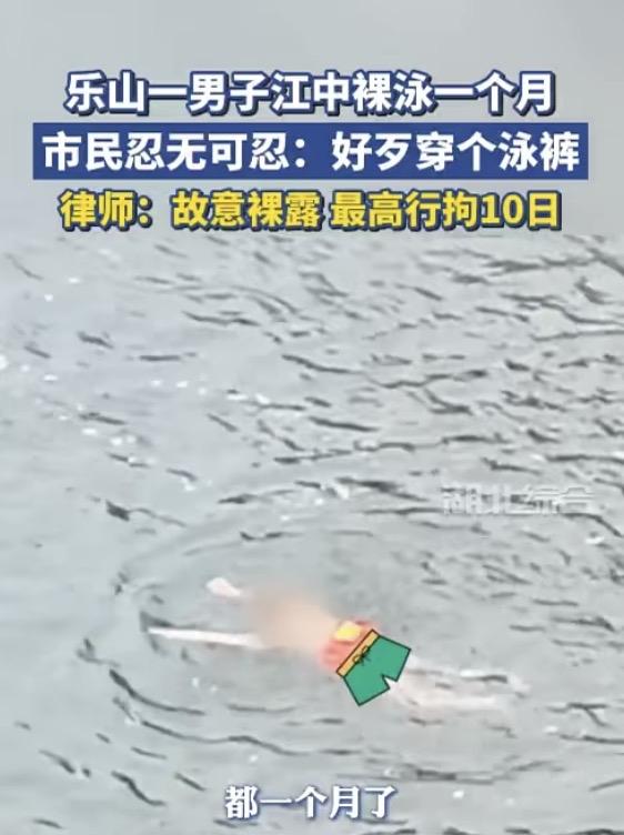哈哈,笑疯了! 一男子在江里裸泳,还十分自律,每天都是这样。 一位女士看了一个月,忍不住了,就把这位裸泳的大哥给举报了! 这件事被网友知道了,纷纷留言。不过言论是两极分化。 有网友认为“这位女士不地道,天天去看,看腻了就去举报,太精了。” 还有网友说“公共场所不是家里的私人泳池,裸泳有伤风化,太不文雅了。” 确实啊,在公众场合游泳还是得注意些,好歹穿条裤衩,万一水中有啥意外,还能保护一下自己不是。 不过大哥在水里游泳,大姐能看出没穿衣服,说明这水质挺好的。 大家觉得大姐举报大哥,这样做对吗?