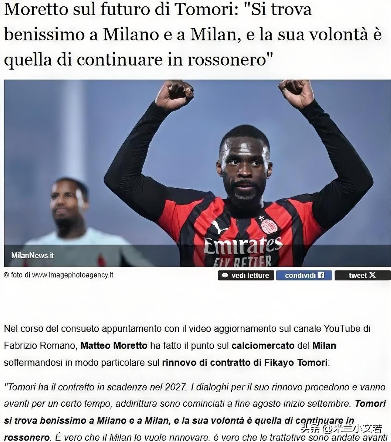 托莫里期待可以留在米兰!托莫里入选了英格兰国家队,他并没有对回归英格兰国家队做出回应,但他对与米兰的合同给出了肯定的回答,托莫里期望可以留在米兰。 托莫里的合同将于2027年到期。关于他续约的对话正在进行中,托莫里对米兰这座城市以及米兰俱乐部感到非常满意,托莫里的意愿是继续留在红黑军团。托莫里的续约比连续剧还连续剧,每个月都有托莫里即将完成续约的新闻,每个月都没有签字的官宣,不知道俱乐部和球员经纪人到底啥时候真的可以谈明白。 米兰跟队记者莫雷托针对托莫里的续约问题说的是据我所知米兰俱乐部也同样想要续约托莫里。如果米兰俱乐部真的想留下托莫里,就拿出诚意来,原价续约托莫里都能答应,当打之年的球员都愿意接受丧权辱国的条件了,俱乐部差不多得了,不能逮着老实人往死里欺负。