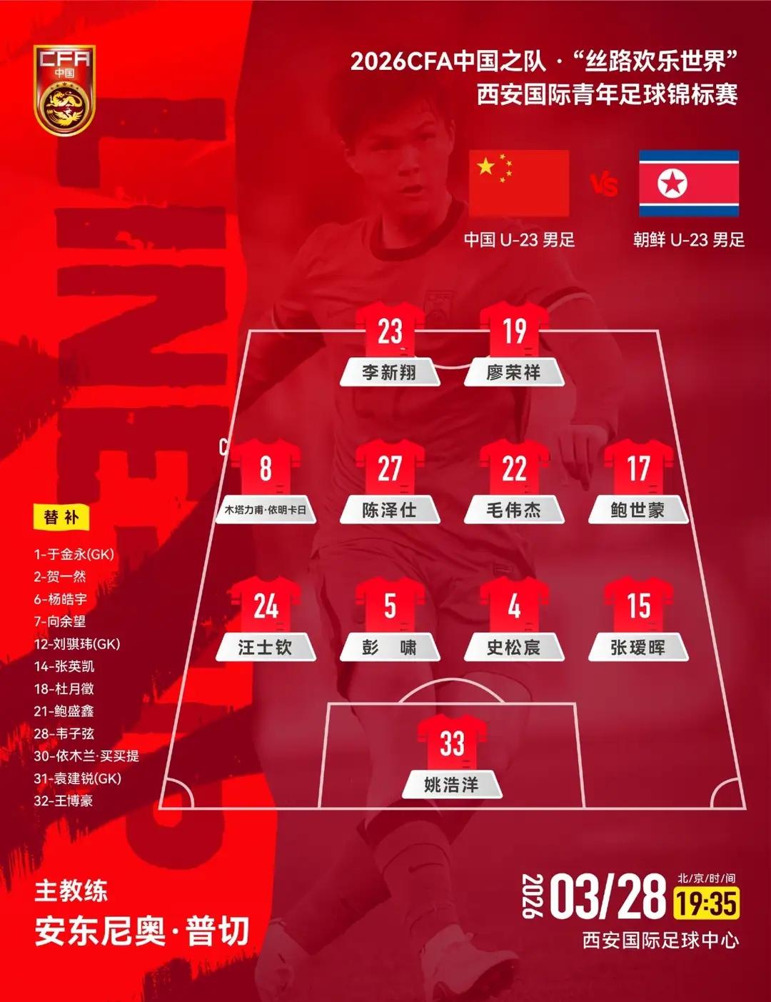 朝鲜1比0中国,安东尼奥大变阵,今天中国U23对阵朝鲜U23的比赛,主力前锋向余望没有首发,木塔力甫任队长,李新翔和廖荣祥双前锋,今天首发换了6人,安东尼奥大面积考察队员,今天比赛开始,双方拼抢激烈,中国队进攻打不上去,朝鲜U23逐渐占据优势,接连制造了好几次角球和定位球,中国队有点压力山大,果不其然,21分钟,朝鲜队员禁区抢二点率先打破僵局,朝鲜U23队1比0领先中国U23了。 中国U23队员进攻打不出来,中场还是乏力啊!希望依木兰下半场能有替补出场机会,34分钟,中国队定位球机会也浪费了,目前35分钟,中国队还没有1次射正球门,今天这个首发状态堪忧啊!希望中国队上半场能扳平比分,希望下半场中国队能多进几球,争取拿下胜利,不要辜负了今天现场这么多球迷的支持,中国队加油!