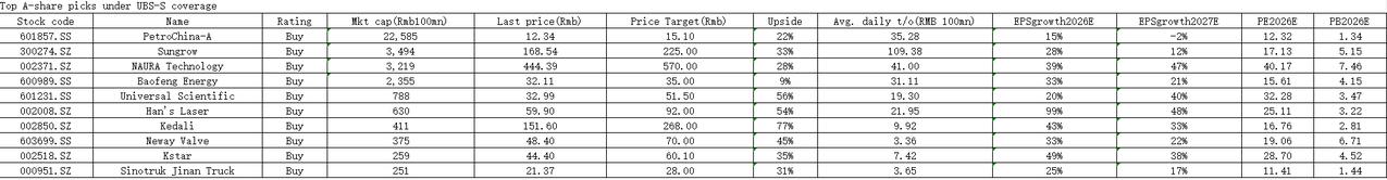 世界顶级投行瑞银UBS在3月24日发布中国权益市场策略研究报告,聚焦全球地缘政治风险和油价波动的背景下,中国A股市场的近期表现及未来投资机会,核心内容总结如下: 1. 地缘政治与油价影响:中国对石油和天然气依赖度较低,A股各行业及主要指数对短期油价剧烈波动并不敏感。当前A股隐含波动率低于海外主要市场及历史贸易摩擦时期,展现出较强韧性,短期的“去风险”过程已接近尾声。 2. 企业盈利与基本面改善:若油价维持先高后落的走势,有望推动PPI在二季度转正。得益于政策支持、“反内卷”推进以及强劲的出口与海外业务扩张(有效对冲了原材料上涨压力),非金融A股利润率出现明显回升。2026年初国内消费、投资、出口等多项宏观数据全面超预期,带动市场对A股盈利预期出现历史上罕见的显著上修,预计2026年A股整体盈利增速可达8%。4月财报季将是验证盈利复苏拐点的关键窗口。 3. 流动性与估值修复:M1-M2剪刀差扩大显示金融体系流动性充裕,年内巨量到期存款有望间接流入股市。年初市场曾因资金快速涌入科技板块导致局部过热,随后在监管调控及全球科技股回调影响下进入震荡整理。期间宽基ETF出现净流出,但行业主题ETF保持稳定,表明资金正转向追逐结构性机会。在宏观刺激及资本市场改革推动下,A股估值中期有望迎来修复。 4. 投资机会与策略:瑞银(UBS)梳理了中国石油、阳光电源、北方华创等10家首选买入标的,这些公司具备极佳的成长性(2026年每股收益预期增速15%-99%)与流动性。整体而言,近期的市场回调在充裕的流动性环境下,反而为投资者提供了优质的结构性买入与中长期布局良机。 今天在另一条微头条的评论里,我告诉一位朋友,普通投资者的估值难点基本在于“方法”与“数据”,摘要页的10家公司数据有点糊,我特意转换为excel表格后把UBS的预测数据贴给大家,这会比你去看那些报数字大小的老师的内容管用上百倍!