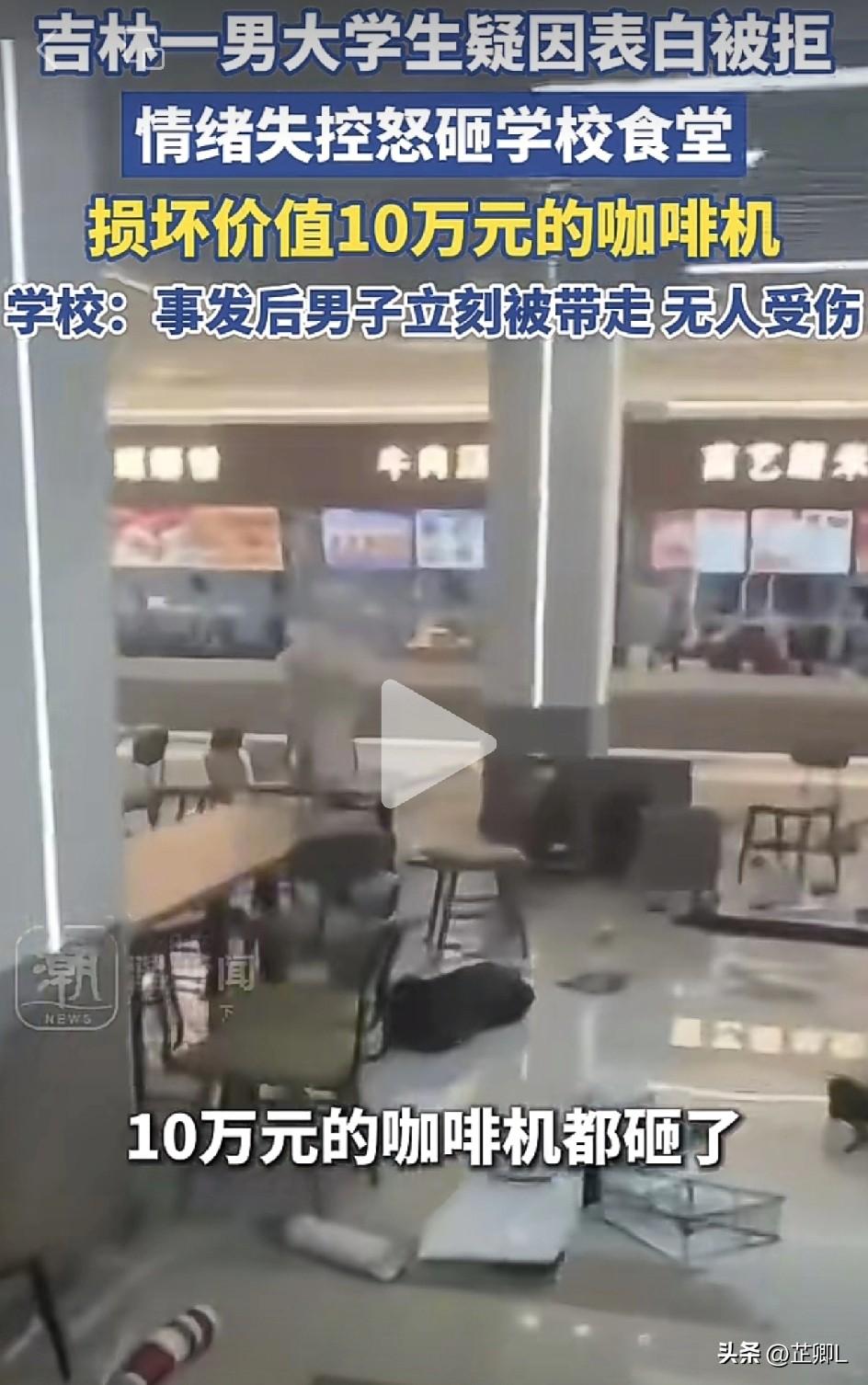 吉林财经大学一男生疑似表白被拒,在食堂打砸设备和菜品,损毁咖啡店十几万设备,太冲动!网友:女生是对的! 3月26日,吉林财经大学发生一件让人无语的事! 一名男生在学校食堂跟女生表白,被拒绝后,当场情绪彻底失控,一边气的跳脚,一边在食堂里发疯打砸。 先是把食堂桌椅掀翻,到处撒公用筷子,还砸坏了消毒箱,紧接着又冲到食堂里的库迪咖啡店,疯狂打砸店里设备。 店里十几万的咖啡机、直饮水机全都被损毁。甚至食堂里好几个档口当天的菜品也被他砸坏糟蹋,现场一片狼藉。 好在学校保安反应快,立马赶到现场把人控制住带走了,万幸的是这场打砸事件没伤到任何人。 据了解,光咖啡店这边的设备损失就十几万,食堂其他设施和菜品也有损坏,具体赔偿还没有公布。 学校工作人员也证实了这件事,男生已经被带离,至于后续怎么处理暂还没有公布。 表白被拒心里难受能理解,但这么冲动搞破坏,不仅要赔钱,还要承担相应责任,实在是太不理智了! 为了一段没成的感情,把自己搭进去,真的不值当! 而女生没有接受他的表白,也是明智,将一切可能的不幸扼杀在了摇篮里,绝了后患! 性格如此不稳定的人,注定不会给身边的人带来幸福! 素材来源:奔赴新闻,侵联删!