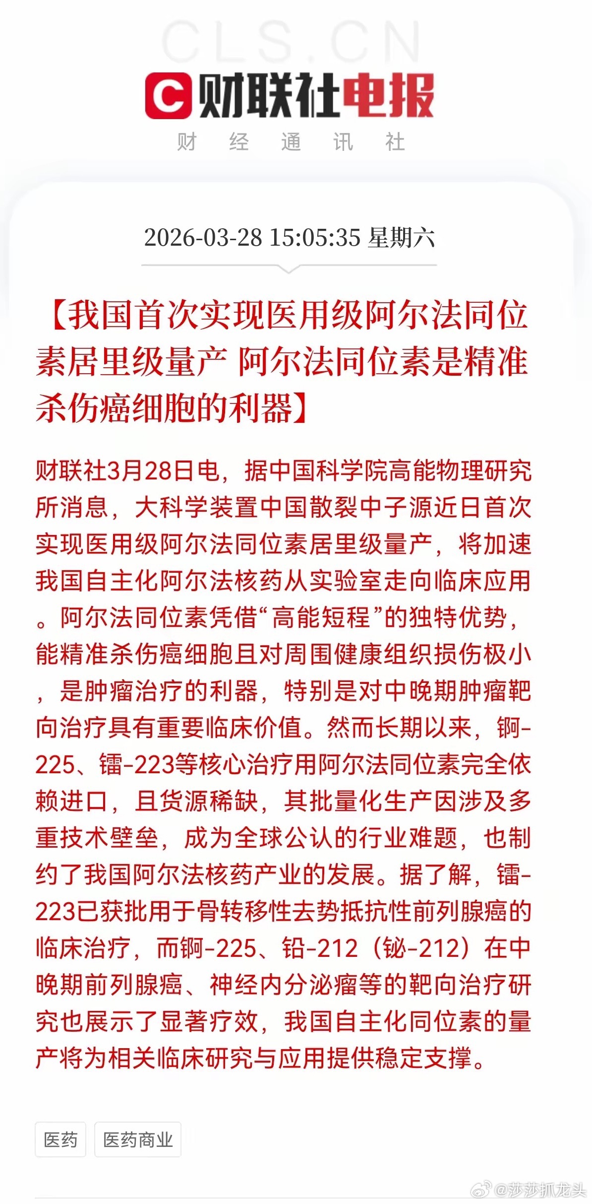 核药赛道迎利好,国产医用级阿尔法同位素量产落地,核药产业迎来关键突破依托中国散裂中子源,我国首次实现医用级阿尔法同位素居里级量产,一举打破了锕-225、镭-223等核心原料长期依赖进口的僵局,为国内阿尔法核药的临床转化扫清了关键障碍。这类核素凭借“高能短程”的特性,既能精准杀伤癌细胞,又几乎不损伤健康组织,是中晚期肿瘤靶向治疗的“利器”,此前却因原料供应受限,多数国内研发管线难以推进。随着国产同位素产能落地,A股核药产业链正迎来新的发展机遇,按上游同位素供应、中游核药研发生产、下游渠道与临床服务三个环节整理,覆盖核心标的与关键逻辑:一、上游:同位素供应与生产环节(核心受益于国产化突破)1. 中广核技(000881)公司布局医用同位素贸易与生产,已开展锕-225等α同位素的相关业务,是国内少数具备同位素供应链能力的企业之一,直接受益于国产同位素量产带来的渠道与应用扩张。2. 中科英华(非A股,补充参考:中科院系同位素研发主体,为A股相关企业提供技术支撑)二、中游:核药研发与生产环节(直接落地α核药管线)1. 东诚药业(002675)国内核药全产业链龙头,旗下蓝纳成生物的225Ac-LNC1011注射液(锕-225标记的PSMA靶向药物)已进入I/II期临床,是国内进展最快的α核药管线之一。公司同时布局同位素生产技术,与中科院相关单位合作推进α同位素的应用落地,直接受益于国产同位素量产带来的研发提速。2. 恒瑞医药(600276)国内创新药龙头,已布局多款放射性核素偶联药物(RDC),包括α核素标记的靶向治疗药物研发,依托强大的临床与商业化能力,有望快速推进管线落地。3. 其他布局RDC/α核药的企业百利天恒(688506):布局多款靶向肿瘤的偶联药物,包括放射性核素偶联药物的研发管线。药明康德(603259):为全球RDC药物提供CDMO服务,包括α核素偶联药物的工艺开发与生产,国内α核药管线的研发提速将带动其订单增长。三、下游:核药房渠道与临床服务环节(承接核药商业化落地)1. 中国同辐(H股,补充参考:国内核药房龙头,A股相关标的为其产业链配套企业)2. 东诚药业(002675):公司拥有国内第二大核药房网络,具备核药的配送与临床应用能力,是α核药商业化落地的核心渠道。注:部分企业(如远大医药)为港股标的,未纳入A股清单;A股标的中,东诚药业是目前α核药管线进展最明确、产业链布局最完整的核心标的,中广核技是上游同位素环节的直接受益标的,药明康德则是CDMO环节的核心弹性标的。