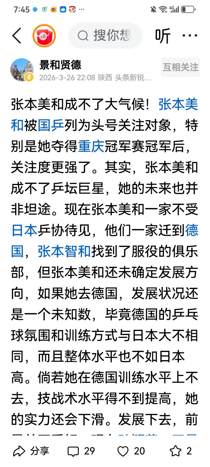 张本美和太优秀了,不要因为人家是对手就不承认人家优秀 一个劲的嘲笑人家,说张本美和成不了大气候,成不了乒坛巨星[捂脸][捂脸][捂脸]这不是在睁眼说瞎话嘲笑自己吗? 张本美和已经成气候了,不到十八岁已经排名世界第5了,获得WTT冠军赛冠军,十六岁上奥运会获得团体银牌,世界乒坛上还有谁,人家已经是乒坛巨星了,全主力主场都输给人家了还不承认人家优秀。应该多向小姑娘学习。