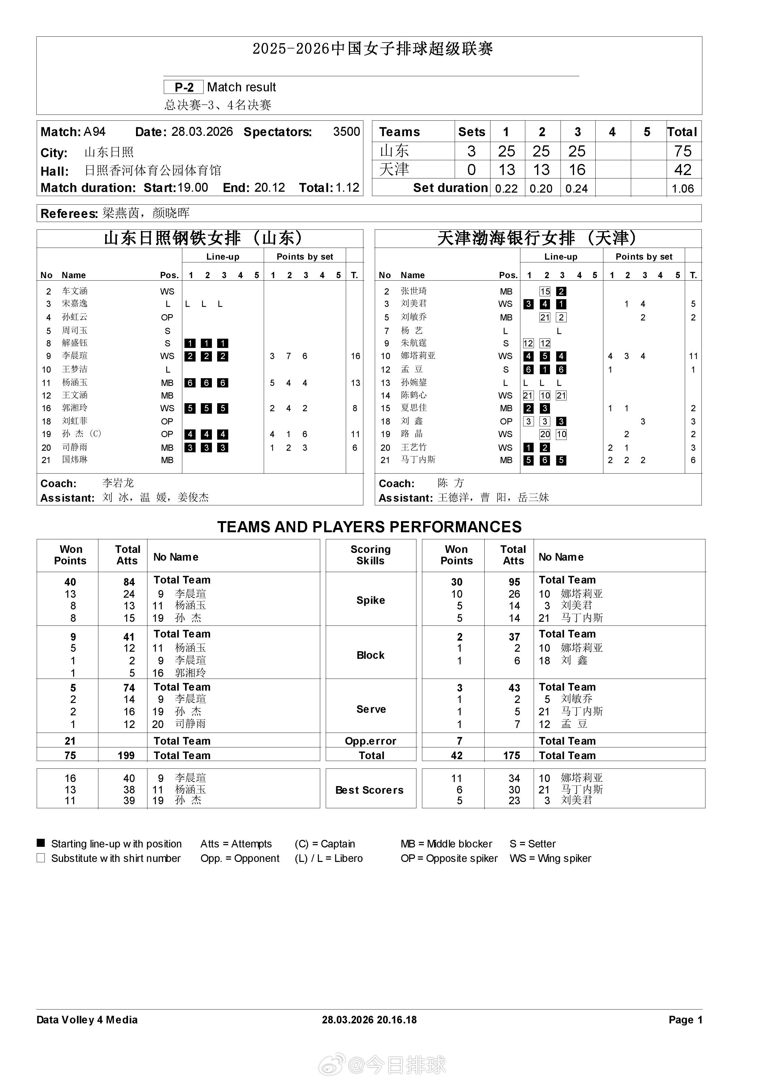 2025-2026中国女排超级联赛 A级总决赛三、四名决赛次回合山东3-0天津得分统计,李晨瑄16分本场最高,杨涵玉拦网得5分。