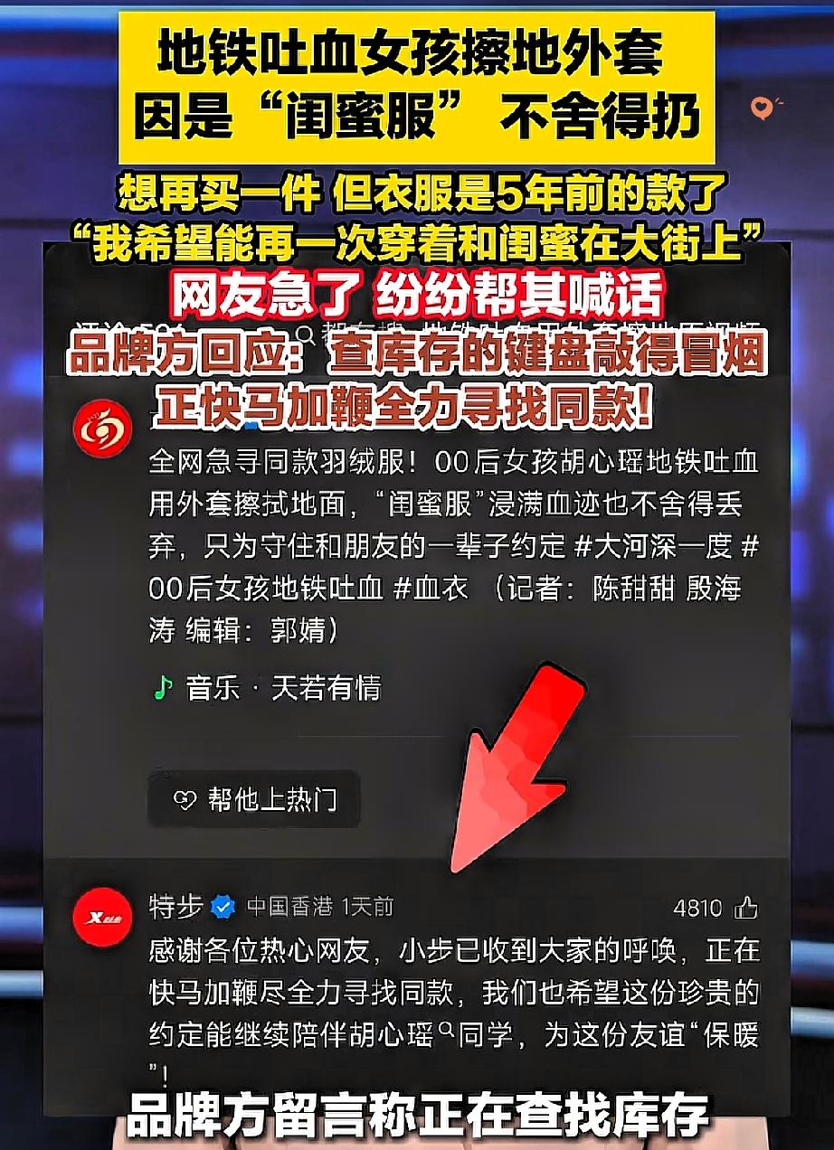 谁能不被这个温柔女孩的善良狠狠戳中内心啊! 地铁里突发身体不适吐血,她第一反应不是顾着自己难受,而是脱下外套默默擦干净地面污渍。 这件沾满痕迹的衣服早已没法再穿,可她始终舍不得丢掉。 原来这是和闺蜜的专属纪念款外套,当年花五六百元入手,承载着多年深厚的友情回忆。 女孩只是想找回同款留住这份美好念想,简单的心愿瞬间刷屏全网。 无数暖心网友自发帮忙搜寻,很快品牌方也暖心回应,全力排查库存尽力帮她圆梦。 温柔终被世界温柔回应,明明自己身处深渊,却还拼尽全力守护体面与善良,这份通透和教养远比外表更动人。 其实最打动人的从来不是衣服本身,而是女孩骨子里的教养与柔软,还有人与人之间双向奔赴的善意。 善良自带光芒,温柔终会被世界温柔以待。你被这份纯粹的美好打动了吗?