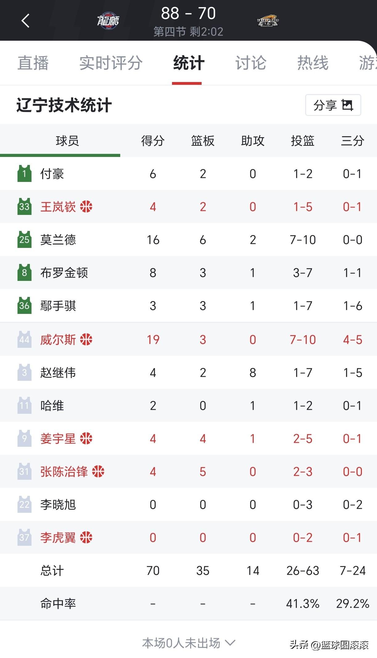 [抓狂][抓狂][抓狂]辽宁队这是怎么了?落后18分,三分24中7,这状态太离谱了!🔥 辽宁球迷要坐不住了!对阵广州龙狮,第四节还剩2分钟,比分居然是70-88,落后整整18分!这还是那支熟悉的总冠军球队吗? 看这技术统计,简直辣眼睛:全队三分球24投仅7中,命中率只有29.2%!除了威尔斯4投5中(哦不对,是4中5?不,看数据是4-5,三分准得离谱),其他人几乎全拉胯! 鄢手骐6中1,赵继伟5中1,王岚嵚、姜宇星、张陈治锋、哈维、李虎翼……三分线外集体迷失,加起来才进1个! 莫兰德、付豪这些内线也没打开,赵继伟8个助攻却换不来得分,全队投篮命中率才41.3%。这状态别说冲冠了,连季后赛都要悬! 不少球迷都在问:这到底是状态低迷,还是另有隐情?难道真的是“放水”?这表现,真的配不上辽宁队的名号啊!
