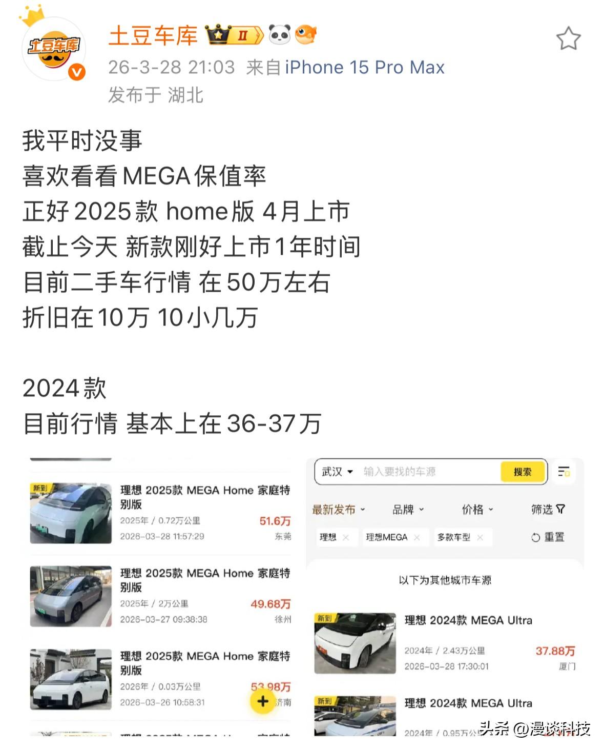 武汉二手车商发出来的二手理想Mega的保值率,刚好上市1年时间,目前二手车行情在50万左右,折旧在10小几万,大家感受下这个保值率可还好? 理想Mega是理想汽车首款纯电大型豪华MPV,主打家庭出行+商务接待双场景,被称作“公路高铁”,是50万级纯电MPV的补能与空间标杆。2025年4月在上海车展发布,官方指导价方面,Ultra智能焕新版52.98万元,Home家庭特别版55.98万元。
