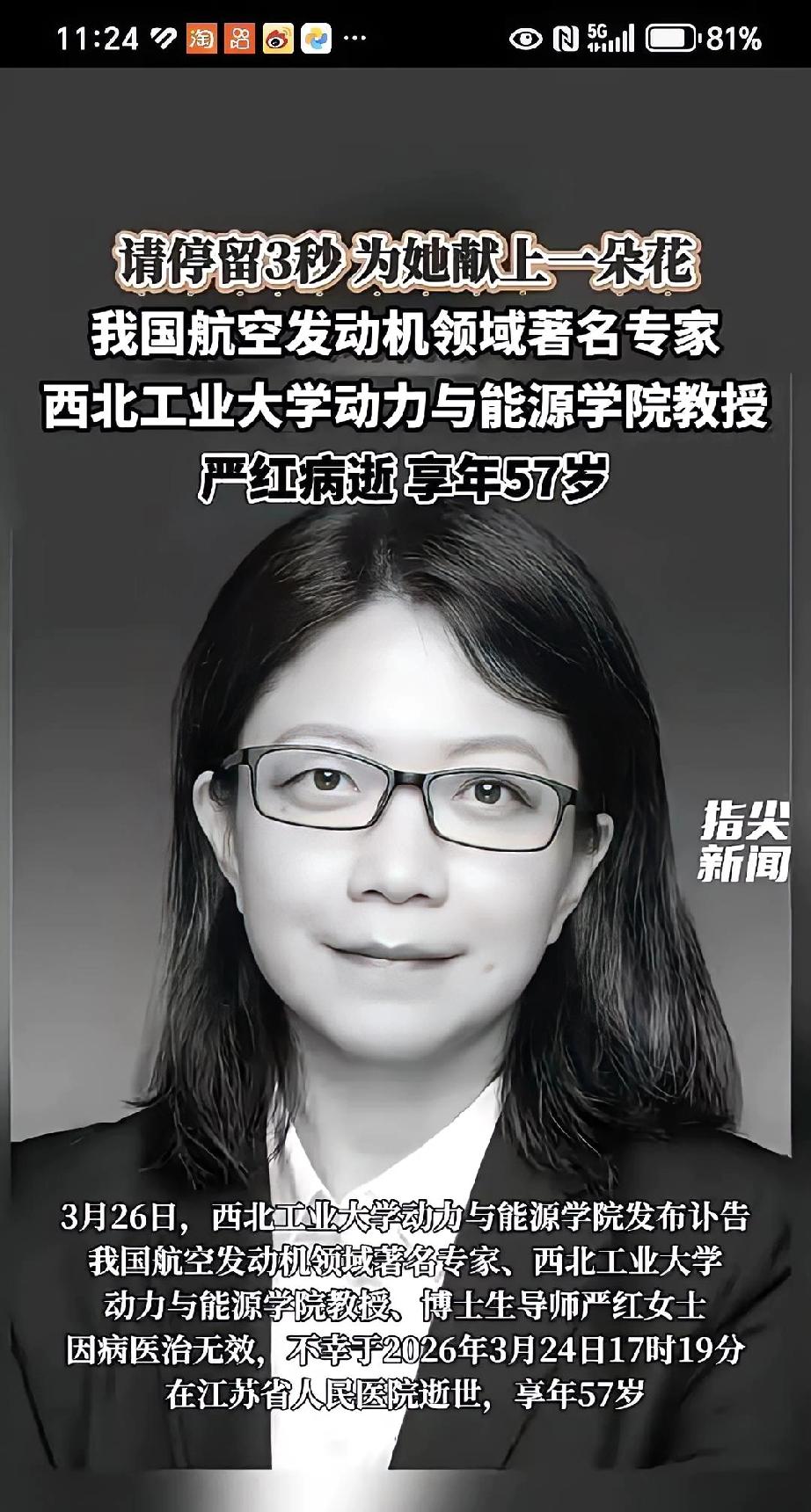 请媒体为这位大国功臣留一席之地 戏子们的搔首弄姿,网红们的招摇过市,终归是过眼云烟。 国家的复兴,人民的幸福还要依赖真正的英雄。 2026年3月24日17时19分,我国航空发动机领域专家严红教授与世长辞,享年57岁。 这位国之栋梁的离去,安静得几乎没掀起多少舆论波澜。 严红教授是西北工业大学动力与能源学院教授、博士生导师。 她是我国航空发动机关键技术攻关路上,不可或缺的中坚力量。 她曾先后在美国罗格斯大学、莱特州立大学任教,拥有优渥的科研与生活条件。 2010年,她毅然放弃海外一切,选择归国扎根西北,为国效力。 归国后的多年里,她深耕科研一线,主持国家数值风洞工程子课题、国家自然科学基金等多项国家级重点项目。 她用毕生所学,为我国航空航天事业突破技术壁垒。 她潜心育人,培养出一批又一批航空领域骨干人才。 这些年轻力量,如今仍在为国产战机装上“中国心”接续奋斗。 我们抬头看见歼-20翱翔蓝天,为国防实力倍感自豪。 却很少有人知道,这背后有严红教授这样的科研人默默托举。 再看当下的舆论场,明星八卦、网红琐事轻松霸占热搜。 严红教授离世的消息,却只在小范围里被人知晓。 不少媒体把大量版面留给流量话题,对为国奉献的功臣却着墨甚少。 这样的舆论偏向,实在让人心寒又惋惜。 流量再高,终会散去;热度再火,不过一时。 唯有为国铸重器、为民谋福祉的英雄,才是民族的脊梁。 我们的舆论场,不该只容得下浮华喧嚣。 更该给严红教授这样的大国功臣,留足应有的位置与敬意。 少年该追的光,是科研报国的坚守;时代该敬的人,是无私奉献的栋梁。 别让为国奉献者,在沉默中被遗忘。 各位读者你们怎么看?欢迎在评论区讨论。