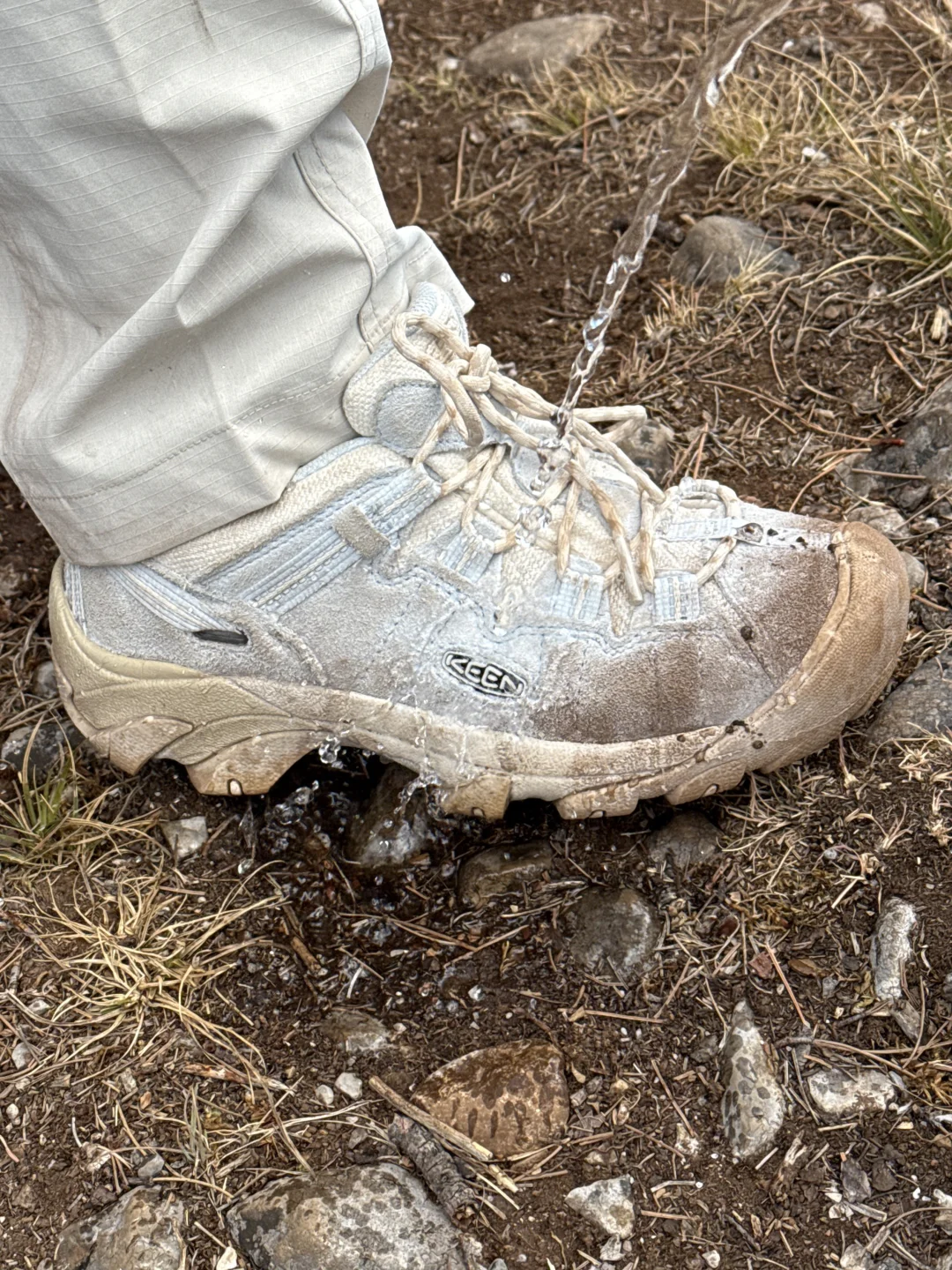牛奶湖旱季是白色的沙地,雨季则变成河流,前几天的融雪在低洼处汇成浅滩,还好KEEN.DRY 防水膜+涂层双重防护能让我安心地行走,就算遇到小水坑,水珠也在鞋面上滚落,鞋内始终保持干爽