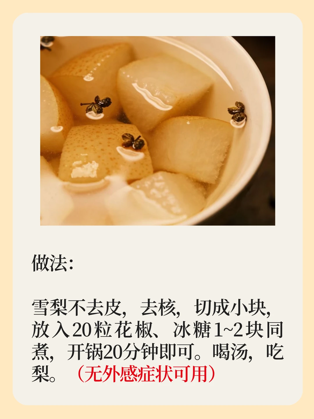 当小朋友感冒过后,已经没有任何感冒症状了,就剩一点咳嗽了,这是家长最头疼的。有很多家长会来问说,怎么只剩这一点咳嗽就是不好呢?[抓狂R] 这里面有些原因是在感冒一开始的时候,过早的给孩子吃了寒凉的药[流汗R],那么这孩子的咳嗽就容易被潜藏起来,因为寒上加寒,把这邪气往里边压,而这种咳嗽不容易好,甚至缠绵不愈,会延续几个月的时间。[清单R]所以大家记住,在外感刚刚受寒的时候,如果流的是清鼻涕,打喷嚏,浑身怕冷,这是受寒感冒,您不要给他用川贝类的制剂,这是老中医的经验,这时候如果用上川贝类的制剂,这孩子的咳嗽就会缠绵不愈,这一点大家要记住。[加一R] [微笑R]另外还有什么情况呢?就是这个孩子脾胃不足,正气不足,无力把最后一点浅藏的邪气排出去。那么这时候呢,就用这怀山药配牛蒡子,这两味配在一起,能把邪气给往外清,给彻底清出去,所以这是非常好的方法。 而今天,我们再介绍一种方法,来看看外感过后寒热错杂引起的咳嗽。[开箱R] 这种咳嗽,您说是寒还热?分不清楚。有时候他没有痰,没有鼻涕,那么您分不清寒热。有的时候呢,这鼻涕和痰呢,一会儿变黄,一会儿变白,这是寒是热呢?这属于寒热错杂。那这时候怎么办呢?可以用花椒炖梨的方法。[耶R] [大笑R]操作: 雪梨不去皮,去核,切成小块,放入20粒花椒、冰糖1~2块同煮,开锅20分钟即可。喝汤,吃梨。 [黄金薯R]划重点: 但是大家记住了,这方子一定是没有一点外感的症状了才用。 有的孩子还发烧,还有黄痰呢,您用这方法没用的[石化R]。我们得说清楚了,是感冒发烧症状已经没有了,最后剩点残余咳嗽,您用才行。这方法介绍给大家,很多家长在恰当的时机用过,都说非常好,说炖了吃以后,第二天就开始咳嗽减少,再喝一天,咳嗽慢慢没了。这说明古人总结的方法是非常有用的,只要您找准时机,用对了,寒热错杂,都有一点的时候,您用这方试一试是没错的。[赞R]