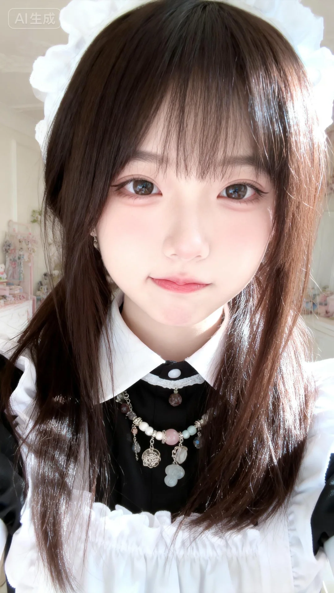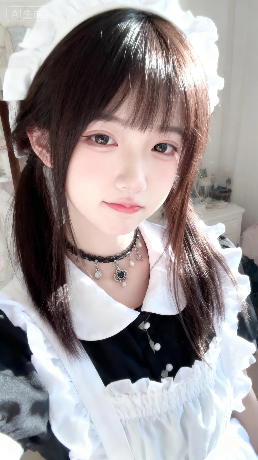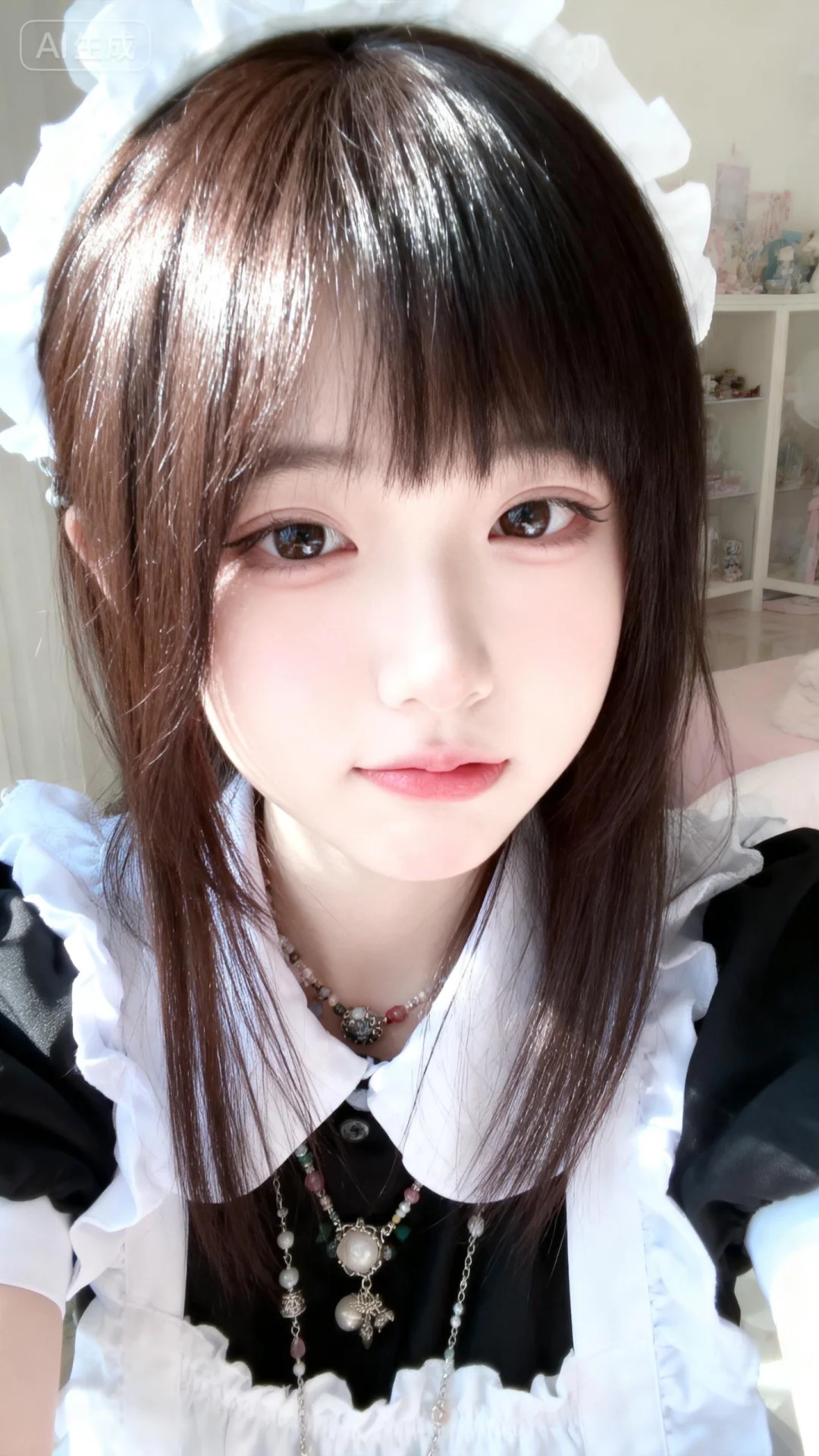 以墨明风格艺术美学呈现画面。画面中的离尘师妹模样极为可爱,有着幼态脸蛋,有着可爱无辜且眼睑下至的眼睛。她拥有深栗棕色森系发型,发丝垂坠且轻抚泛光,瓷感白肌肤,身着随机女僕装,清纯动人,佩戴精品饰品,露出撇嘴的可爱俏皮娇俏微表情,楚楚可怜。画面聚焦面部,高曝高饱和,整体处于明亮輕爽房间的慵懒氛围中,构图平庸,呈现生活快照般的随手一拍抓拍风格。
