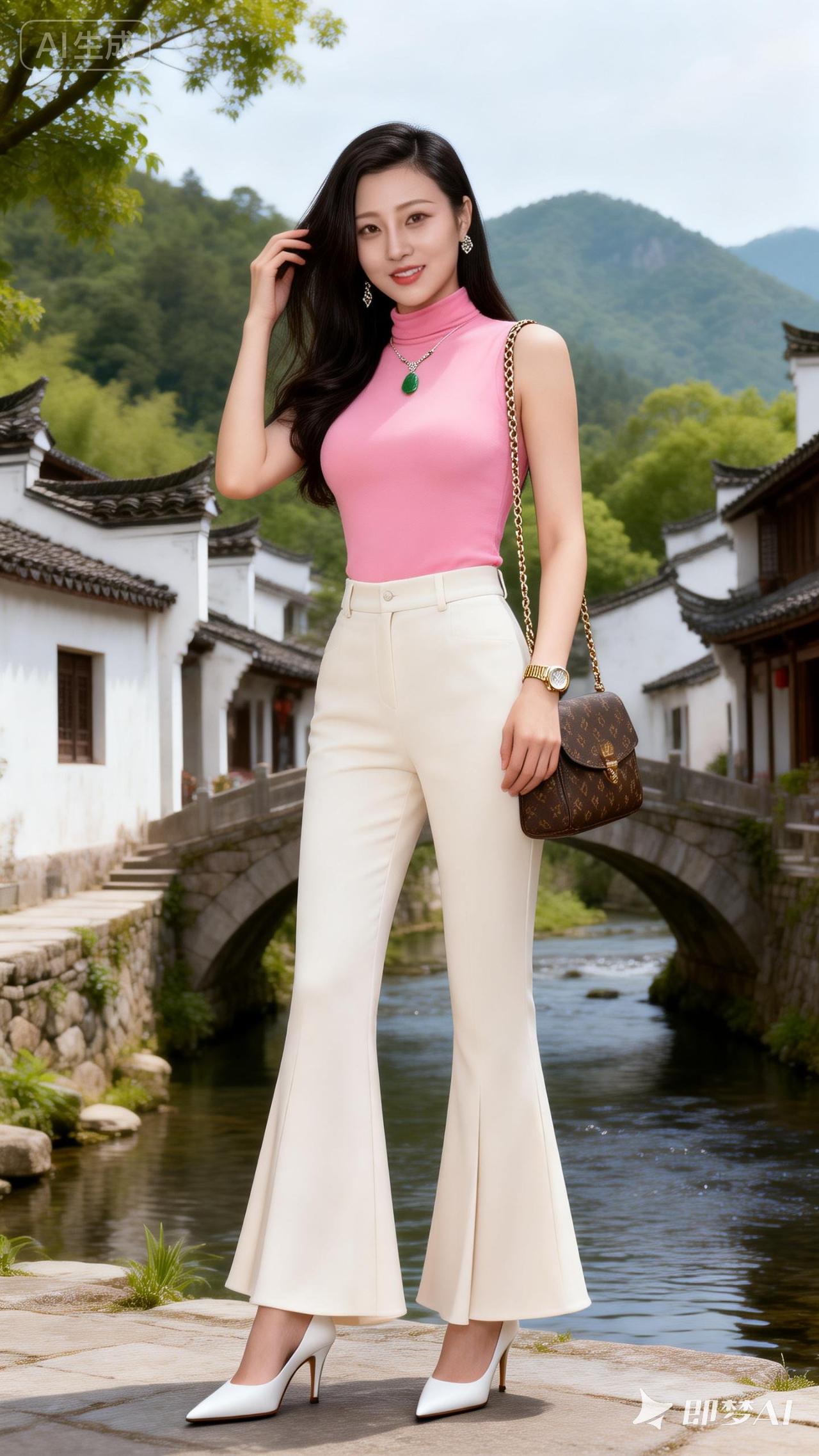 优雅漫步在古风小镇,粉色上衣搭配米色长裤,尽显时尚与古典的完美融合。