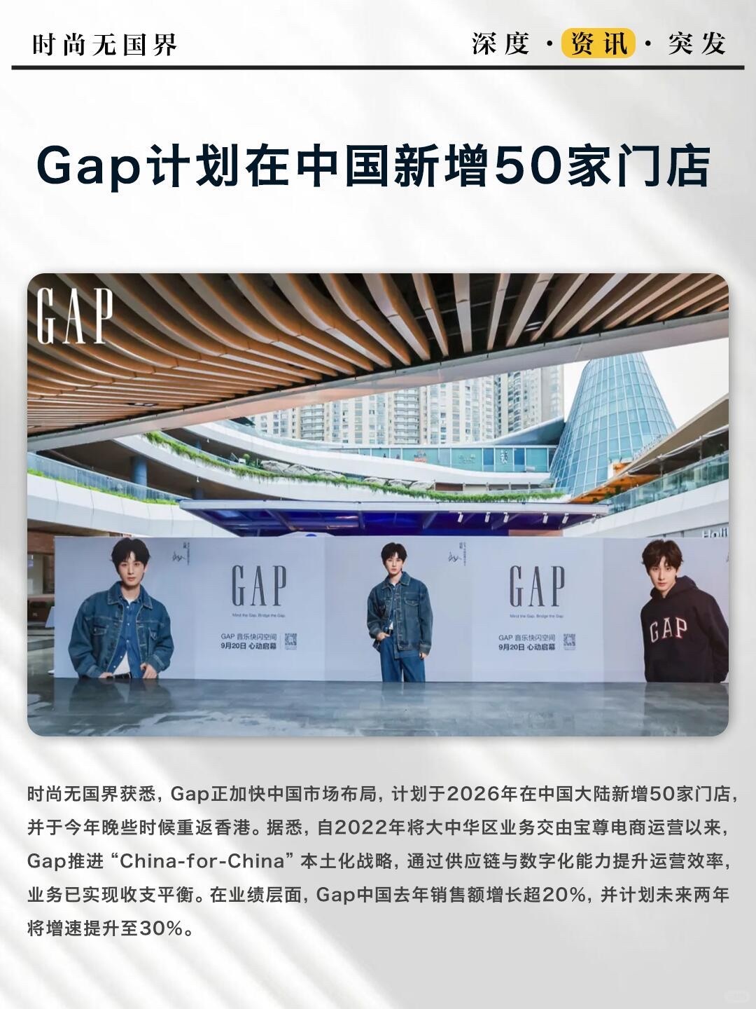 GAP 计划在中国新增50家门店!重返香港!我哩个豆,成毅代言gap,直接盘活了gap这个品牌,提高了品牌的知名度,扩大了影响力!