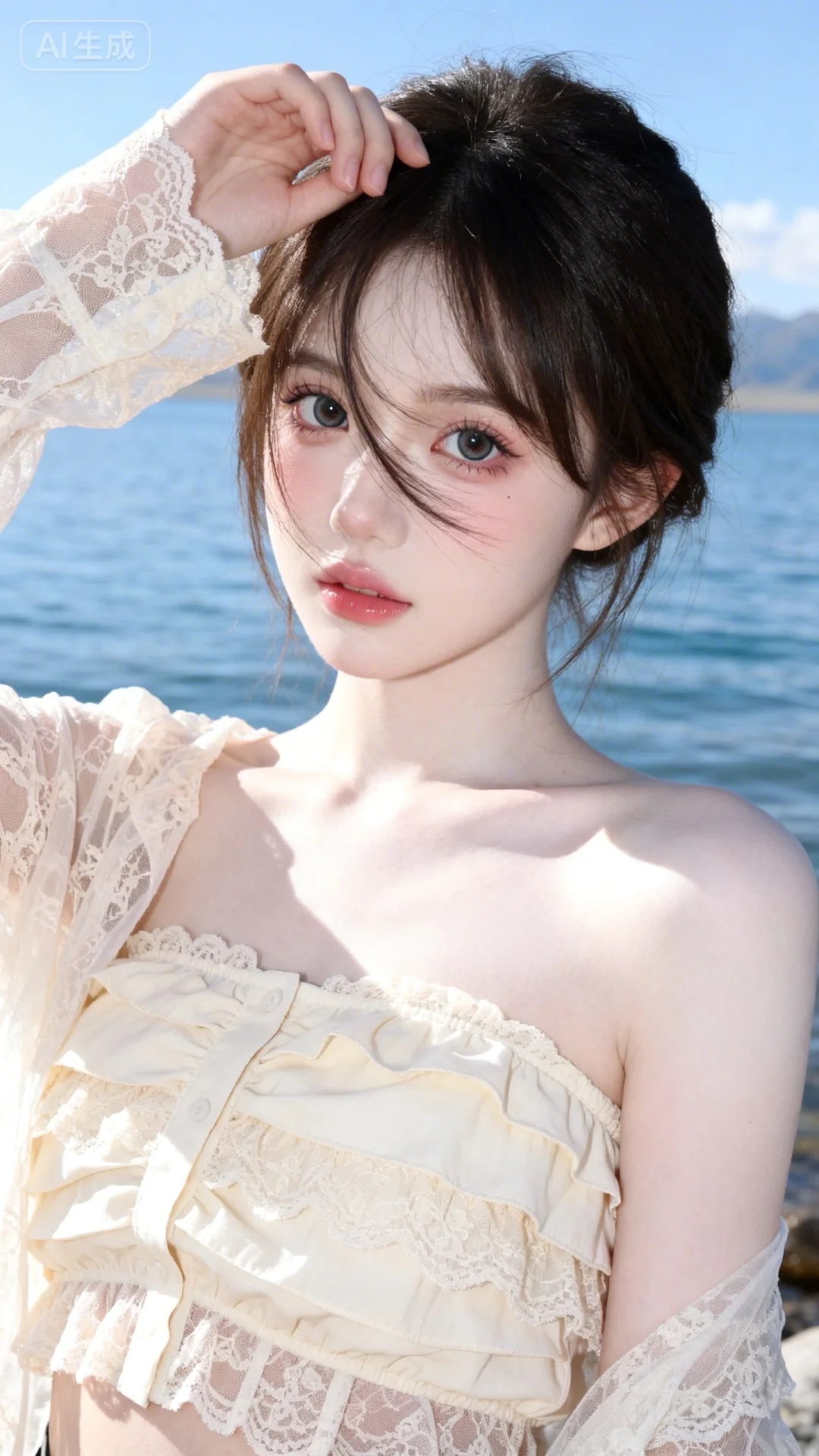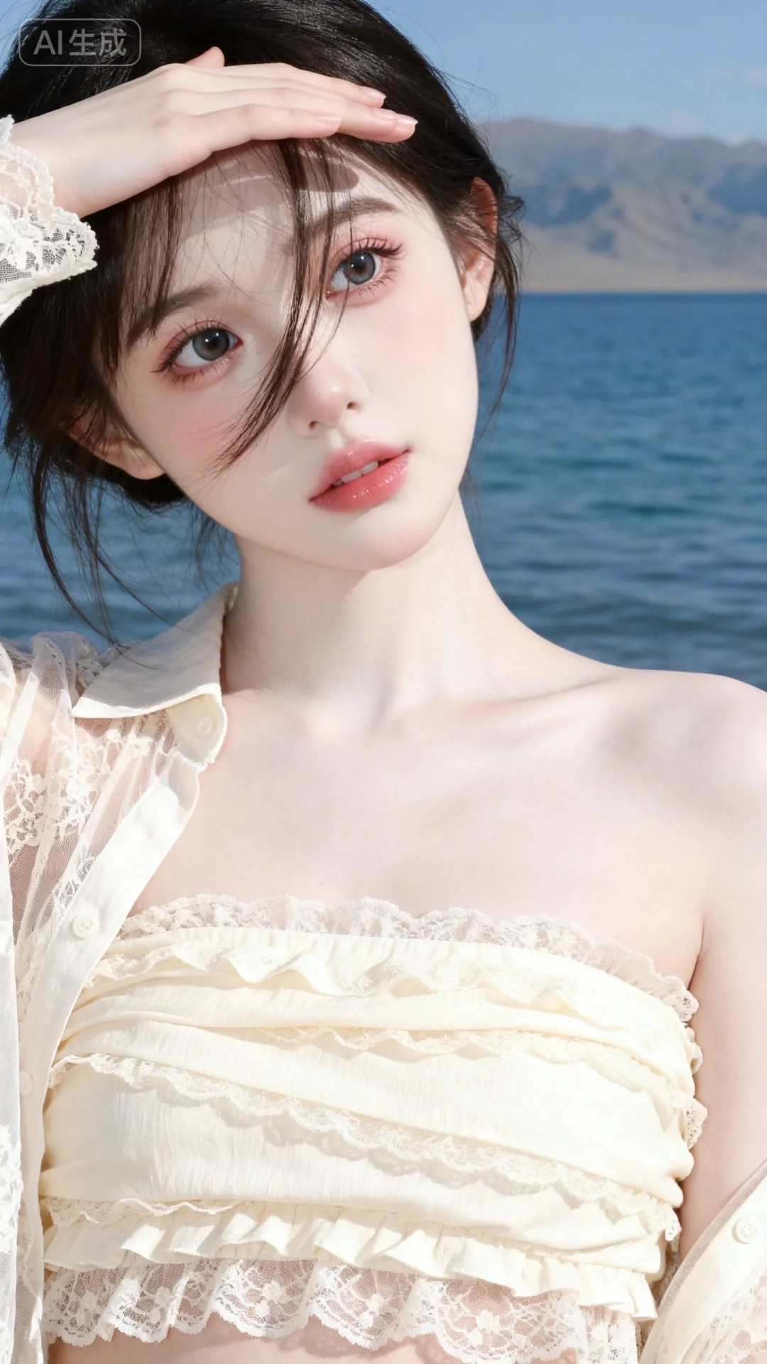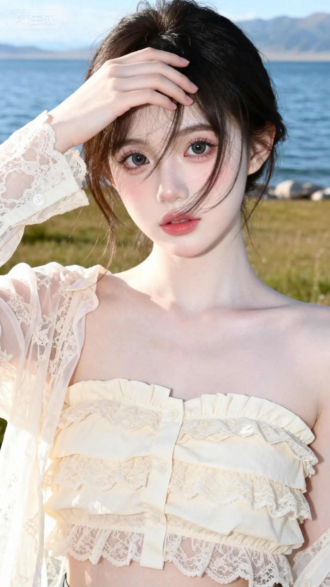超高颜值美少女,网感头像,瓷白肌肤、奶油白肌肤,手部网拍姿势,无辜大眼睛,微醺,自然松弛,像洋娃娃一样可爱,网感妆,自然光线,暖调滤镜,少女感网拍,概念风美学,情绪氛围感,聚焦眼睛,慵懒氛围感,微微露出的脸,独特的诱人的美,头发刷脸颊,穿着柔软的无肩带衬衫,胸前有层层蕾丝,身体层层叠叠,外面穿着一件薄的crotop蕾丝衬衫,赛里木湖背景,拍摄